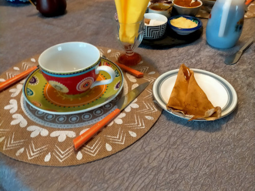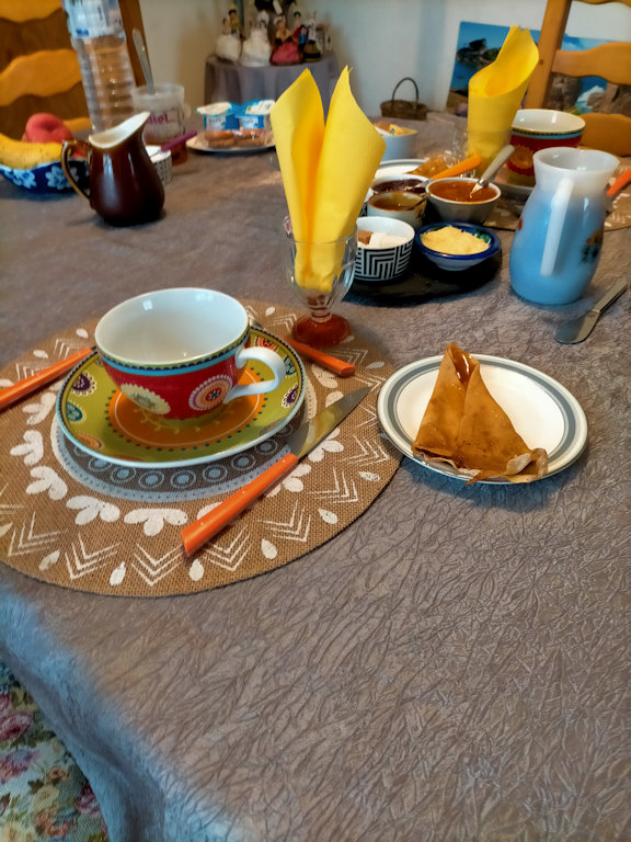 Petit déjeuner copieux, avec crêpes et far breton.