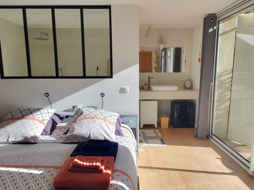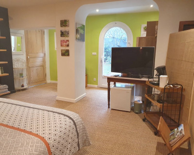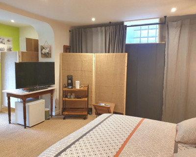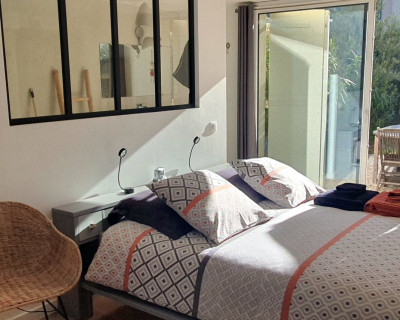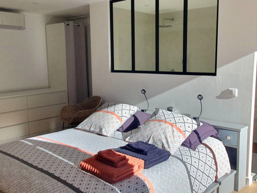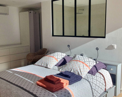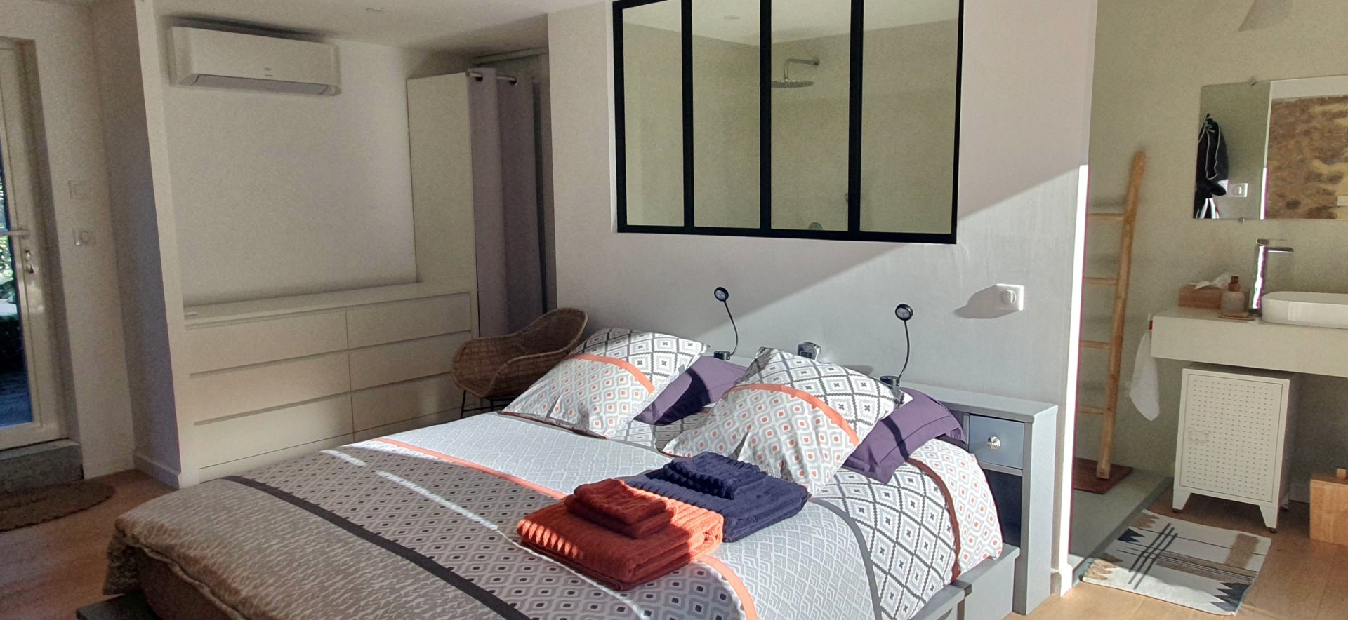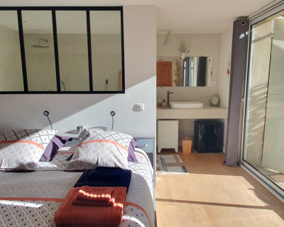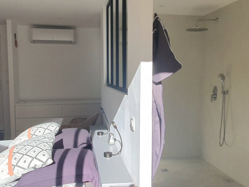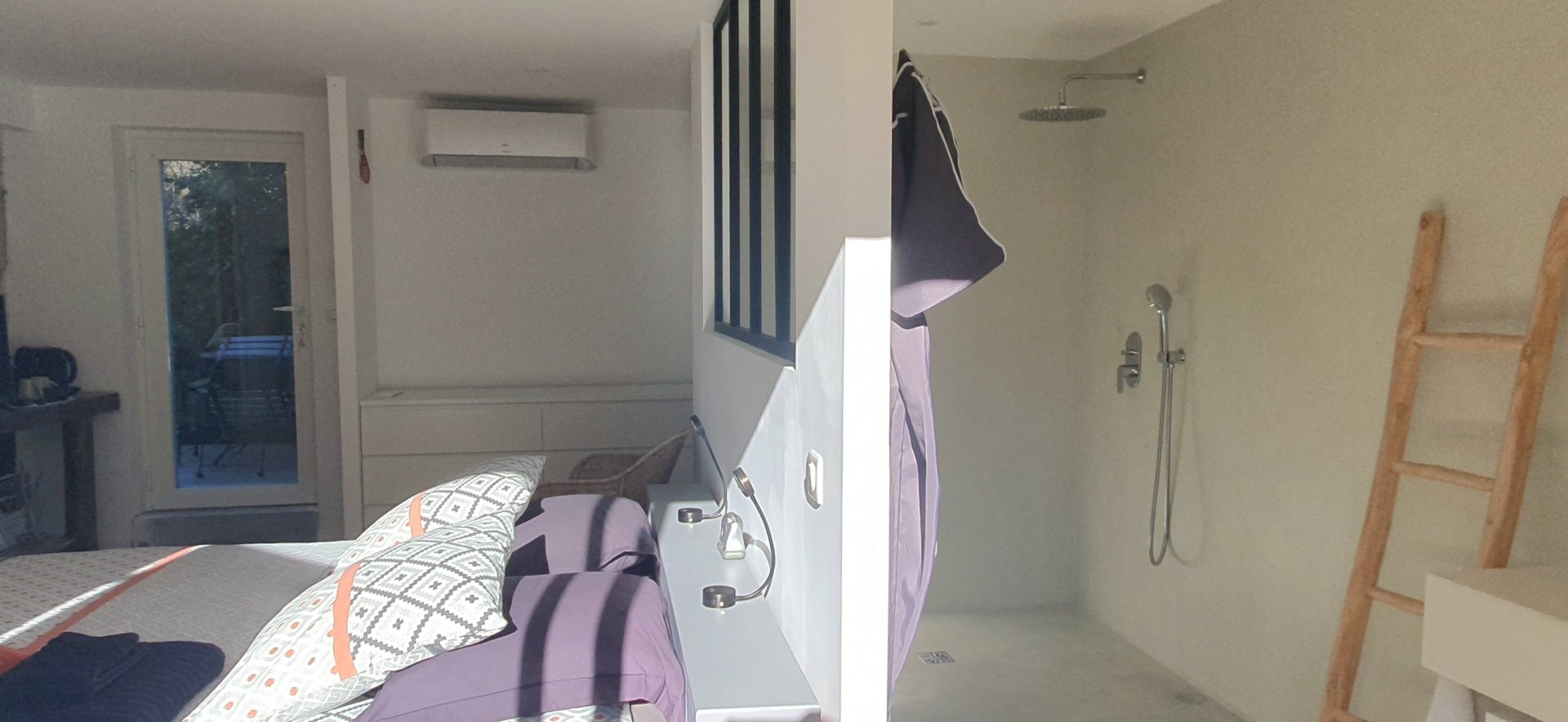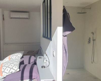 La chambre est équipée d'un WC (séparé de la salle de bain), d'une grande douche à l'italienne, une penderie, des tiroirs de rangement, un téléviseur, une climatisation réversible, un mini-frigo.