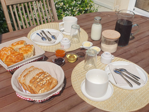 Le petit déjeuner, servi de 8h30 à 10h, est composé de produits locaux et faits maison.