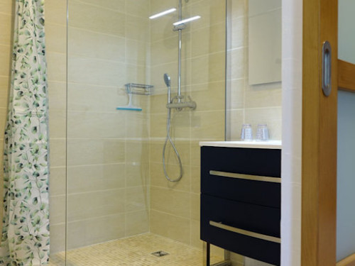Très confortable, elle est équipée d'un lit queen-size en 160 X200, d'une salle de bain avec une grande douche à l'italienne, wc indépendant et d'un coin salon avec bureau.