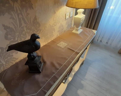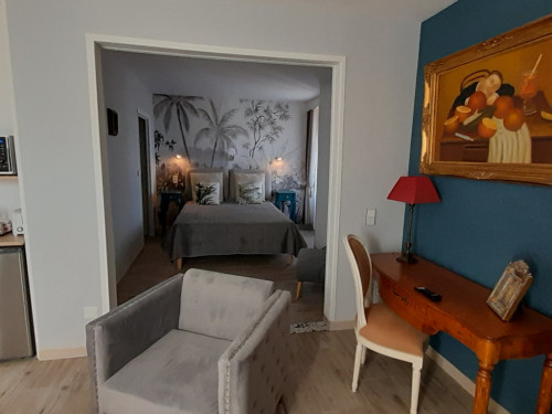 ( Petit déjeuner inclus ) Suite à la décoration baroque tendance dans les tons gris et noir, entrée avec placard et WC, salon avec canapé, table avec 2 fauteuils , kitchenette équipée séparée , chambre avec grand lit king size, placard , salle de bain avec baignoire balnéo et seconde toilettes séparées. Possibilité de louer la suite en gîte à la semaine sans le petit déjeuner à un tarif spécial. Capacité : 2 personnes maximum.