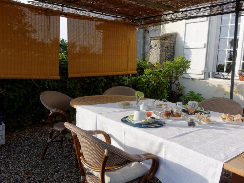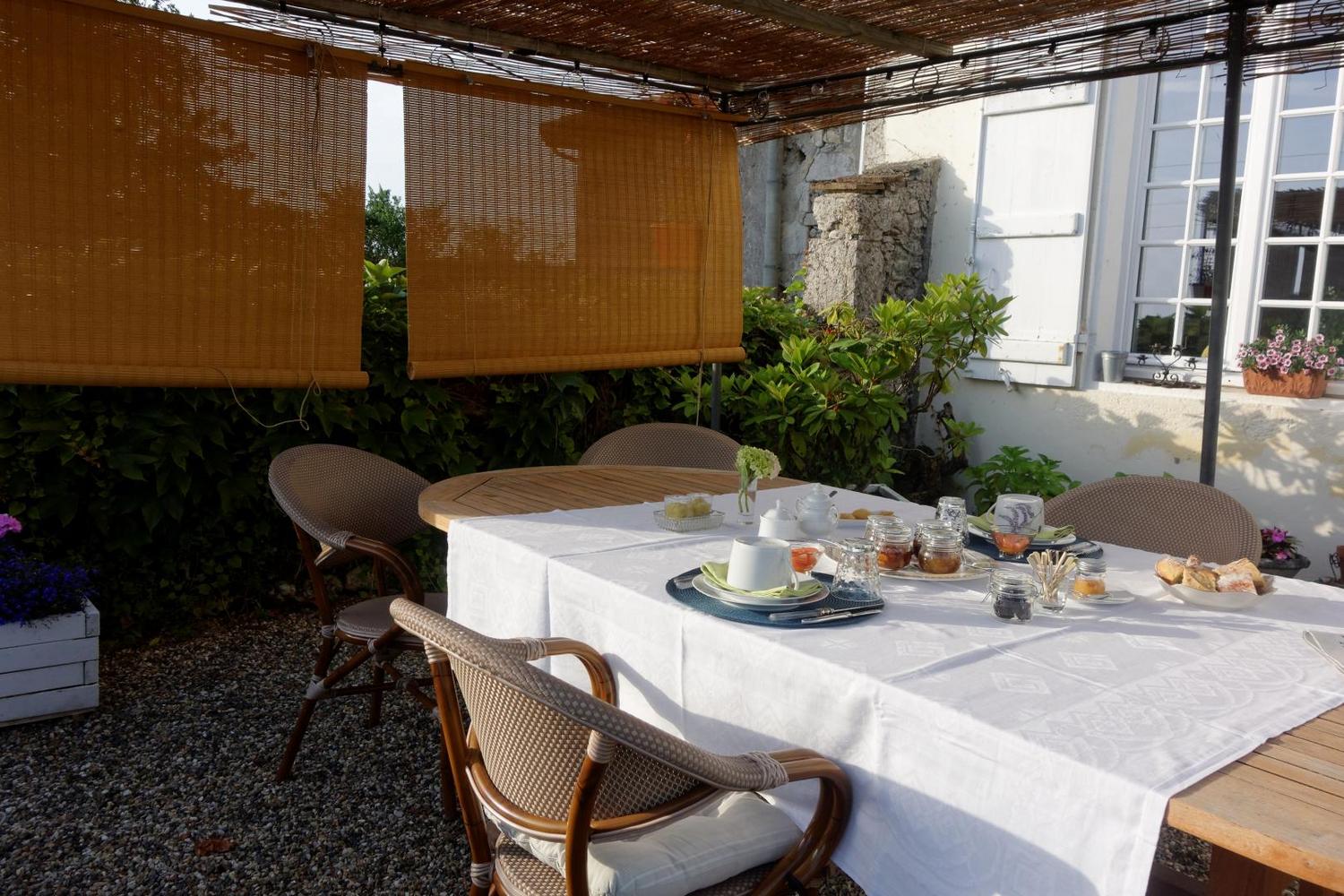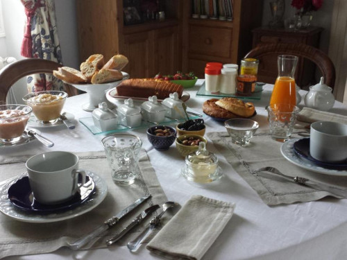 Le petit déjeuner, composé de produits locaux de saison et fait maison (noisettes, pruneaux, fruits, fromages et beurre de pays … confitures, miel, pâtisseries …) est servi sur la terrasse dès les premiers beaux jours, au coin de la cheminée en hiver.
