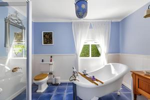 Adjoining the lounge is a beautiful and well appointed double suite, with a panoramic sea view, large sea facing balcony with table and chairs. The suite has one bedroom with a queen-size bed, an en-suite bathroom with separate free standing bath, shower, and an antique oak wash stand, air-conditioning and fan and a mini kitchen with self-catering facilities. The TV has streaming access to You Tube and some international news channels.