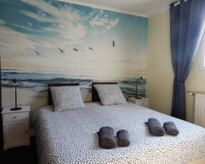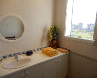 A 300 mètres de la plage, vue panoramique de la chambre et de la salle de bains, petite vue mer, dans une rue calme.