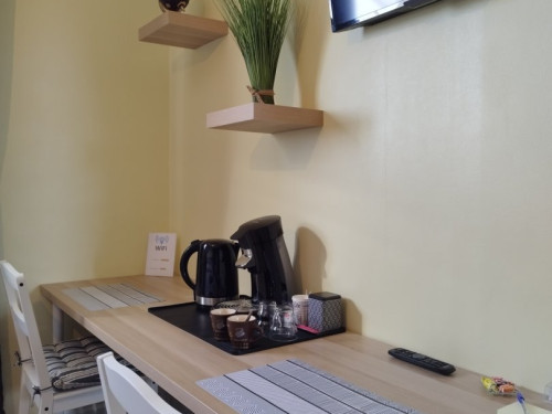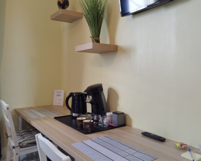 Ce logement dispose d'une petite entrée avec un réfrigérateur, un micro-onde, une cafetière SENSEO et une bouilloire, une chambre, une salle de bain avec douche et un toilette séparé.