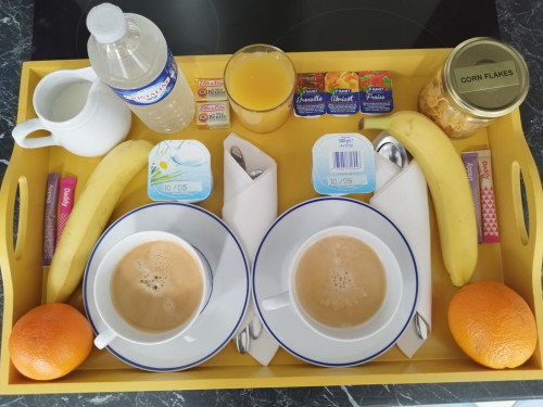 Petit déjeuner servi en chambre sur un plateau à l'heure que vous souhaitez en option.