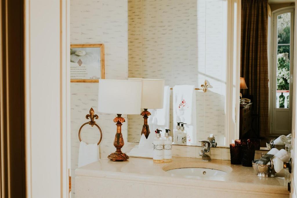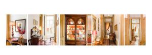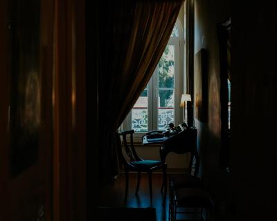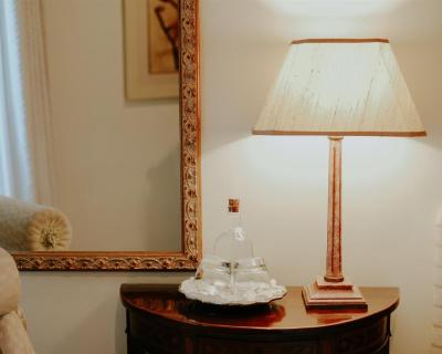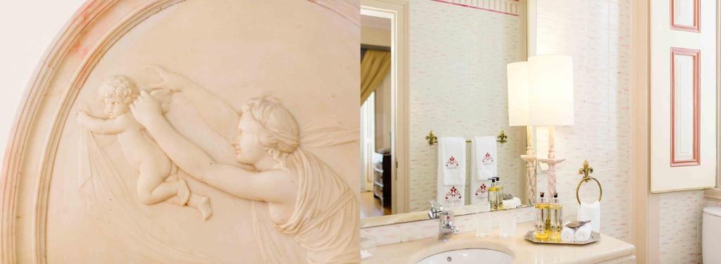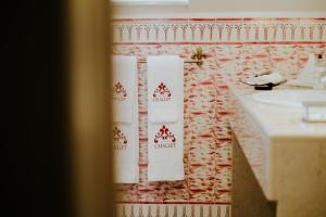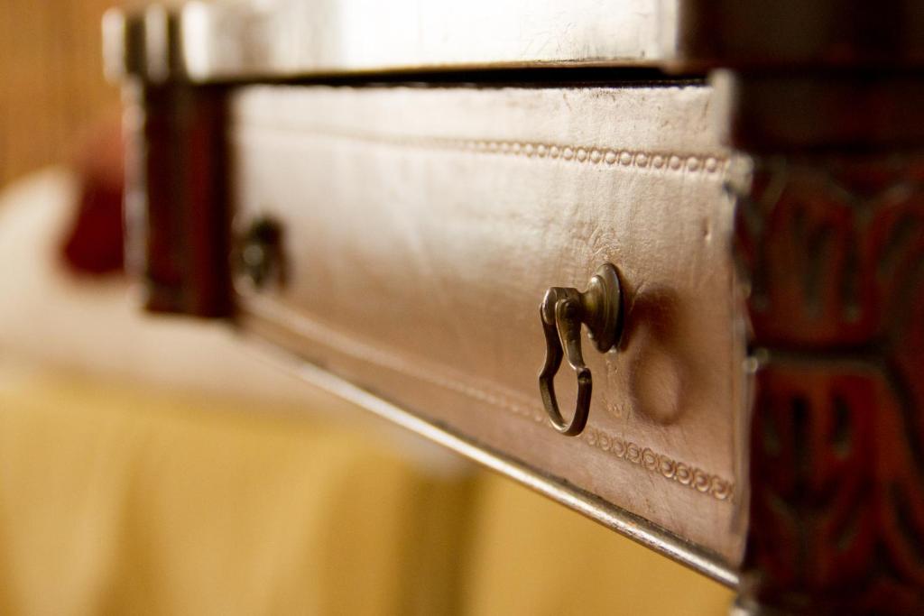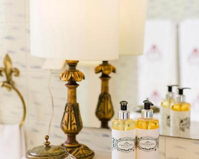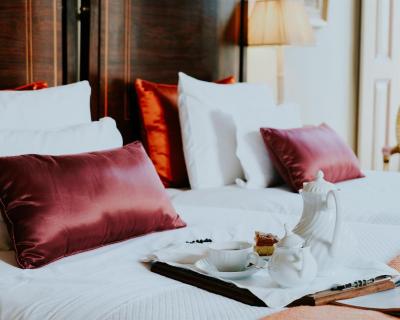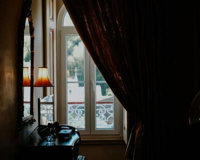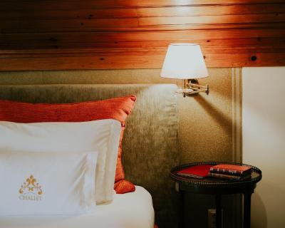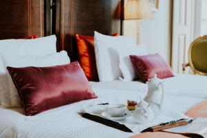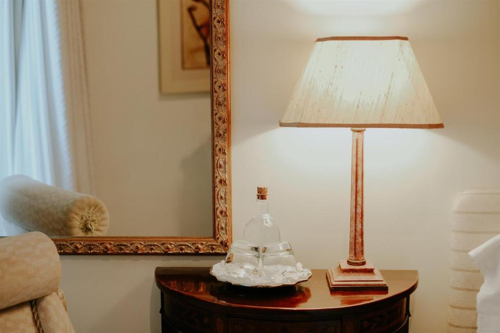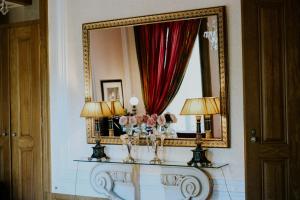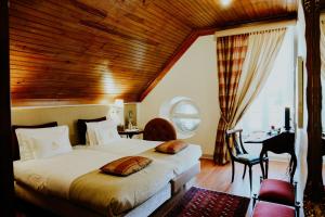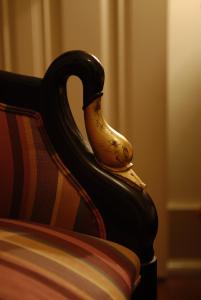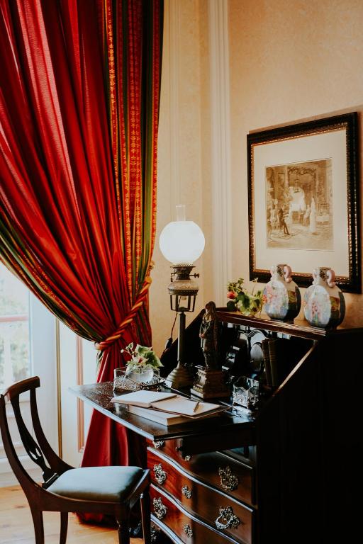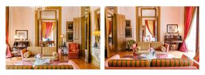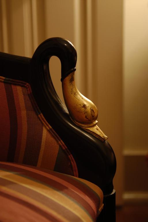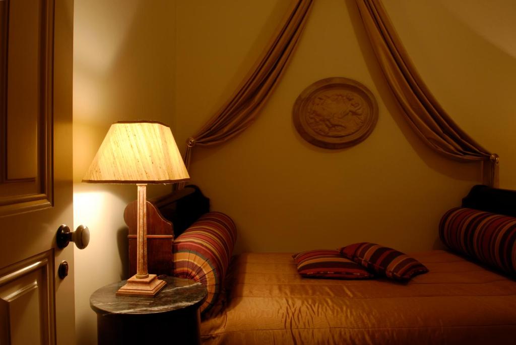 The classic décor includes carpets, golden details, and some rooms have a four-poster bed.