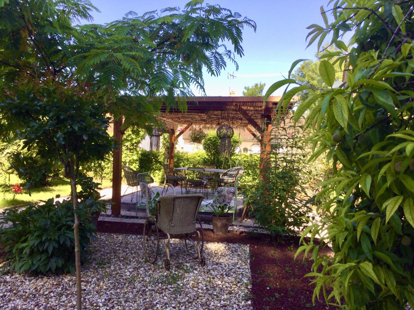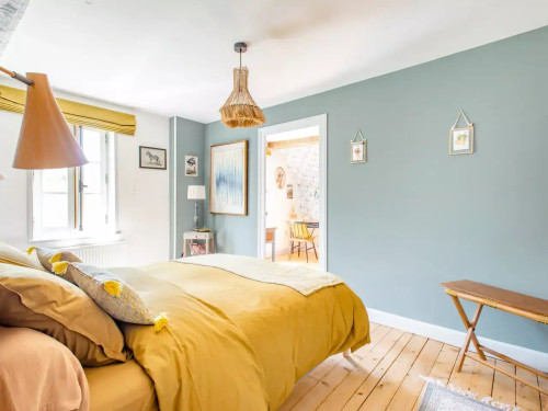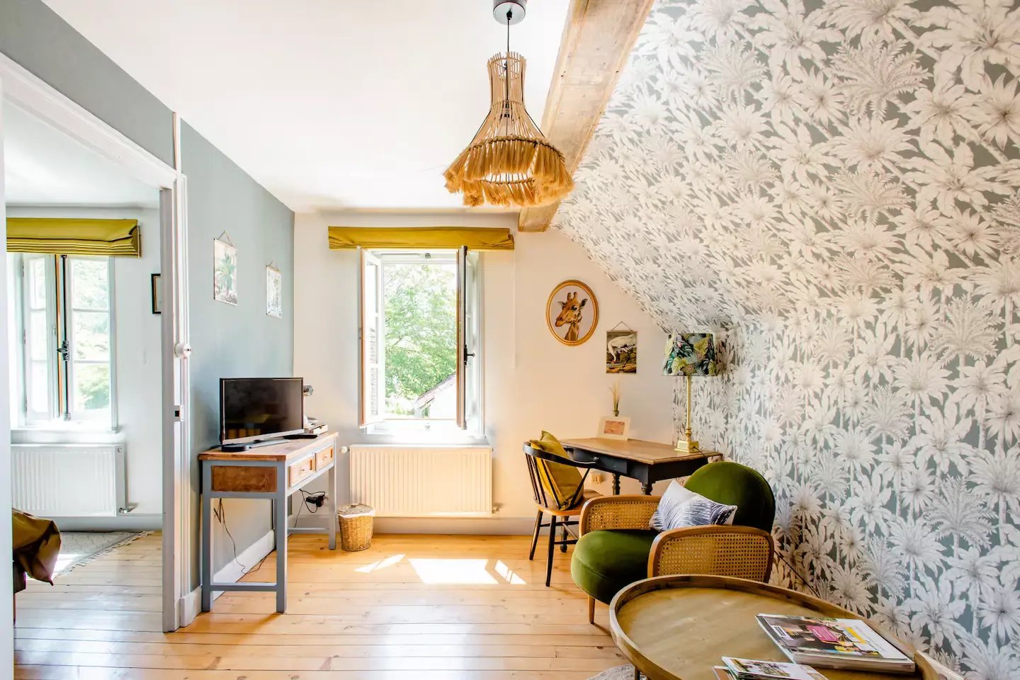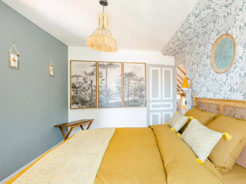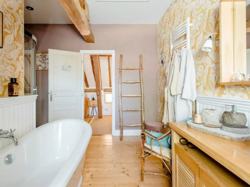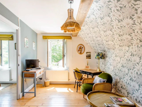 Belle grande chambre avec salon attenant vue sur jardin, grande salle de bain privative avec douche et baignoire.