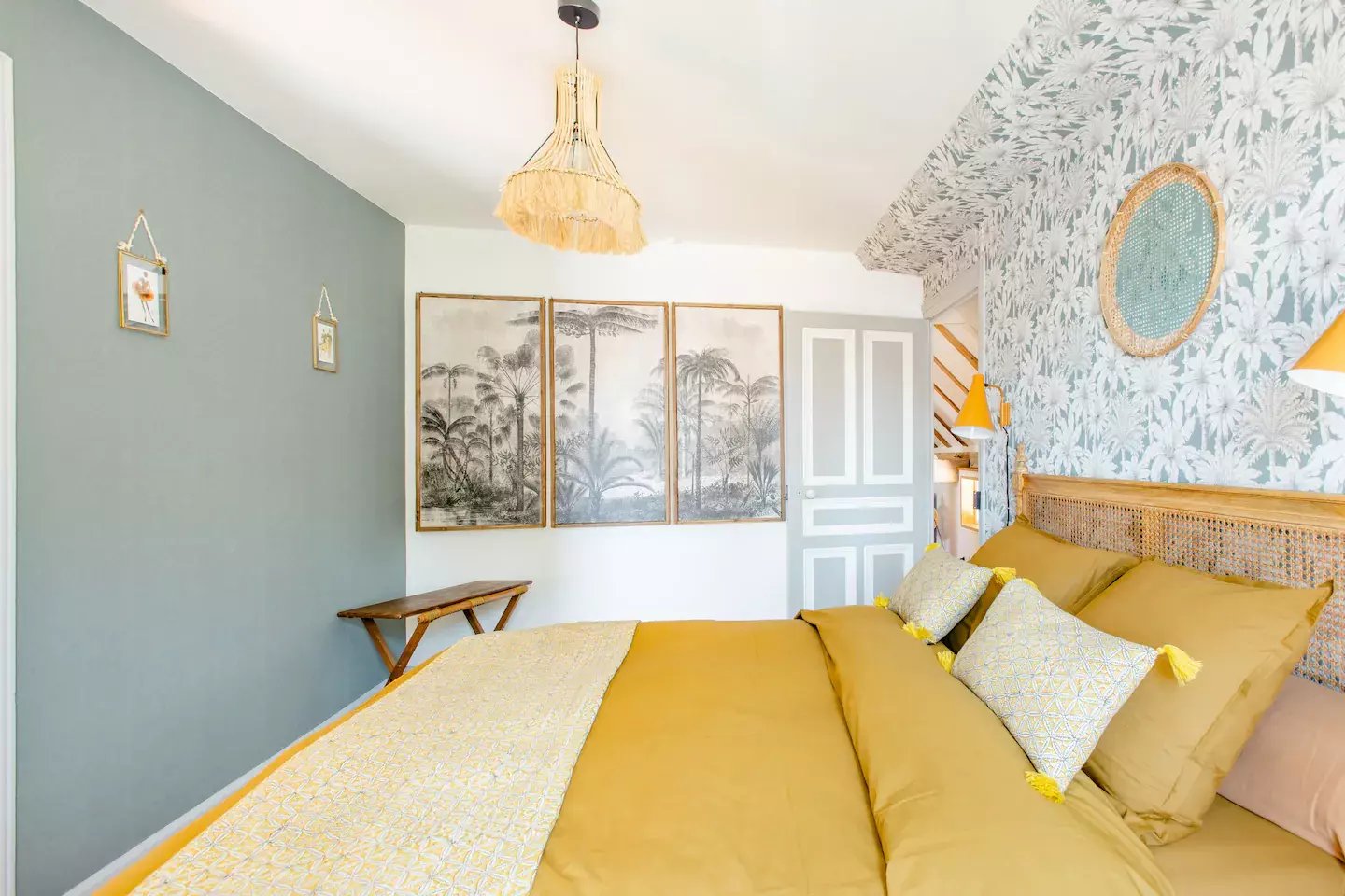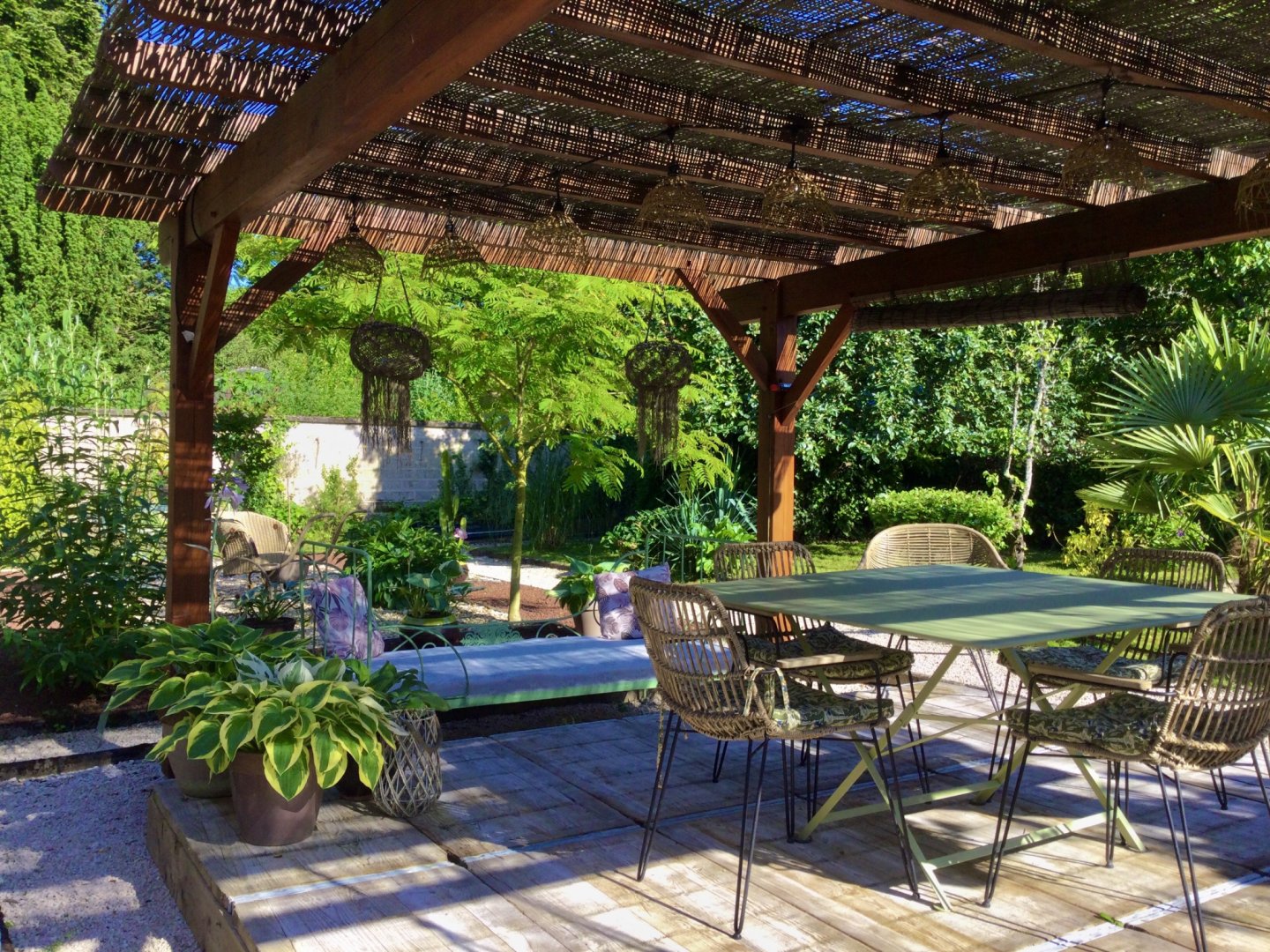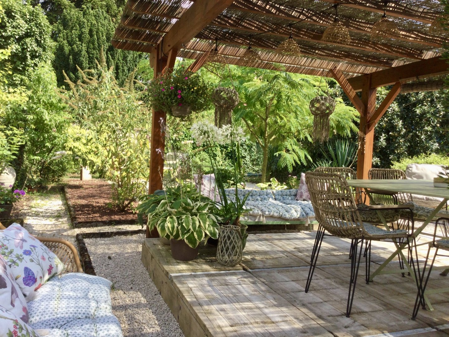 Belle grande chambre avec salon attenant vue sur jardin, grande salle de bain privative avec douche et baignoire.