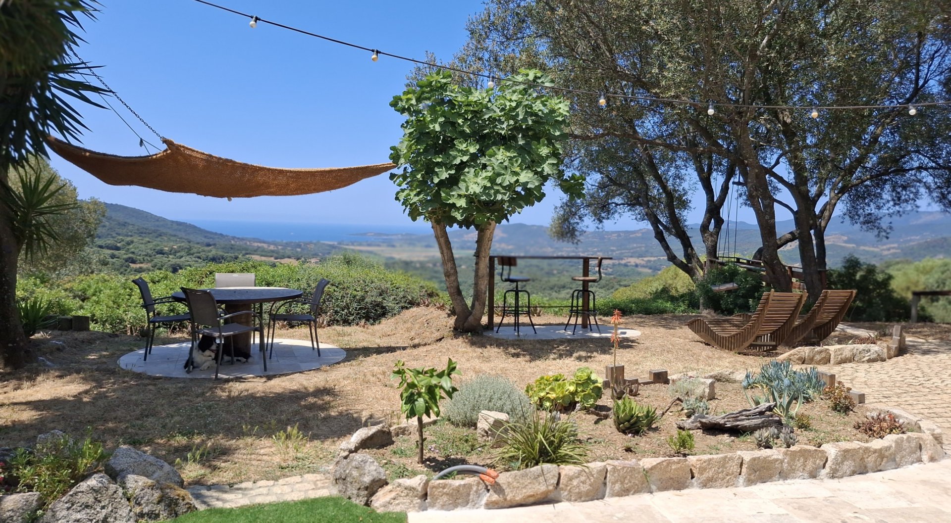 Sandrine et Benoît, ont fait de cet endroit,un petit cocoon,où l'on se sent bien. L'aménagement extérieur est cosy, vous pouvez vous détendre avec un livre ou faire la sieste sur le filet, avec vue sur la baie de Porto pollo. Un terrain de pétanque est à notre disposition, mais nous n'avons pas eu le temps de tirer le cochonnet. La cuisine partagé est une très bonne idée,avec un placard dédié à chaque chambre pour pouvoir ranger la nourriture. La propreté est irréprochable.