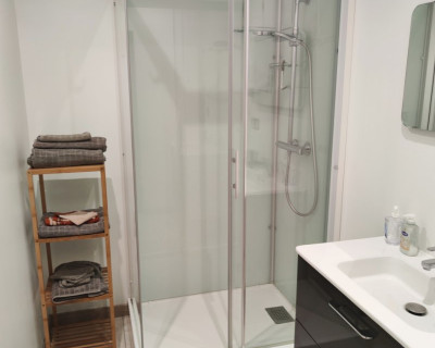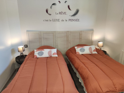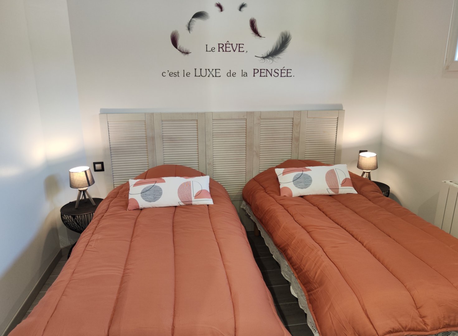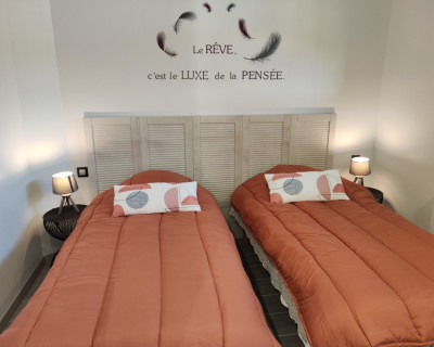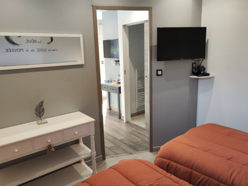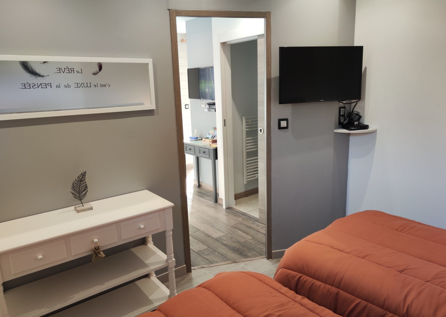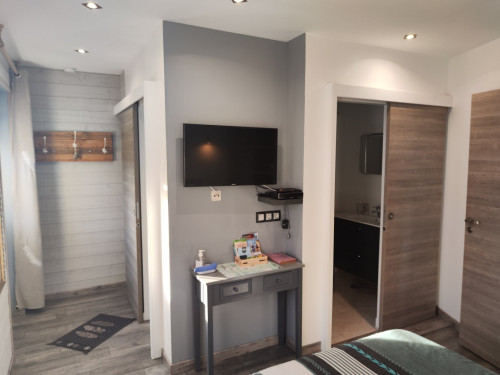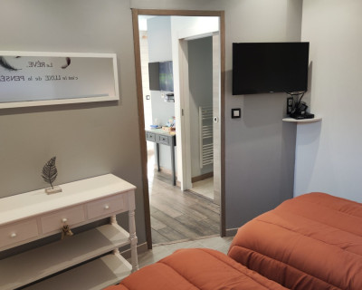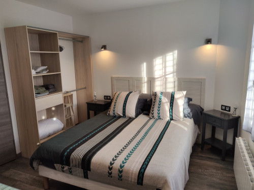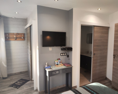 Nous vous accueillons dans une chambre double comportant la chambre principale pour deux adultes et une chambre attenante pouvant convenir à un adulte ou 1, voire 2 enfants. D'une salle de bains moderne et toilettes séparé.