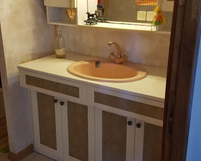 Salle de bain privative de l'autre côté du couloir : lavabo et douche, linge de toilette, sèche-cheveux