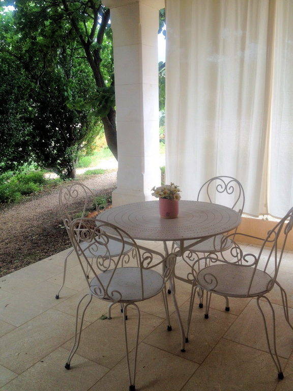 Nous avons occupé la chambre d’hôtes « La Bergerie » qui nous a donné l’impression de faire partie de la propriété car totalement intégrée dans le jardin de par son ouverture totale sur l’extérieur avec ses baies vitrées. Nous avons été complètement conquis par cette ouverture, digne d’une villa balinaise, avec en contrebas, la piscine à gauche et le salon de jardin sous la pergola à droite. Sans oublier la terrasse privative avec transats et table dont nous disposions également.