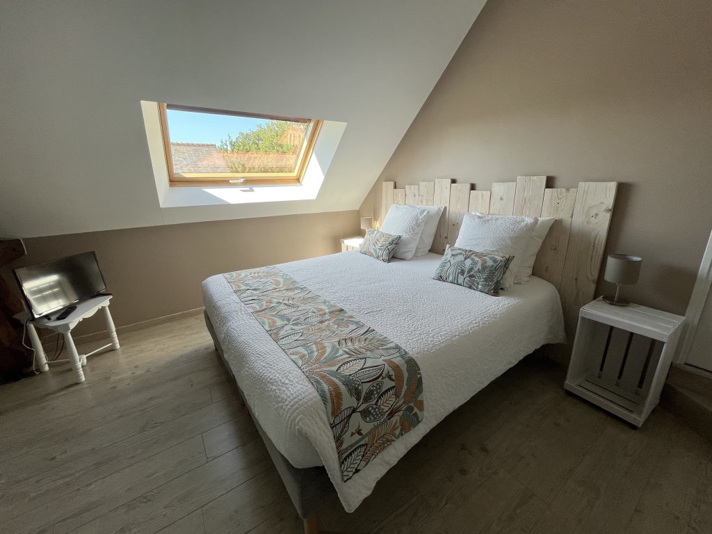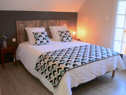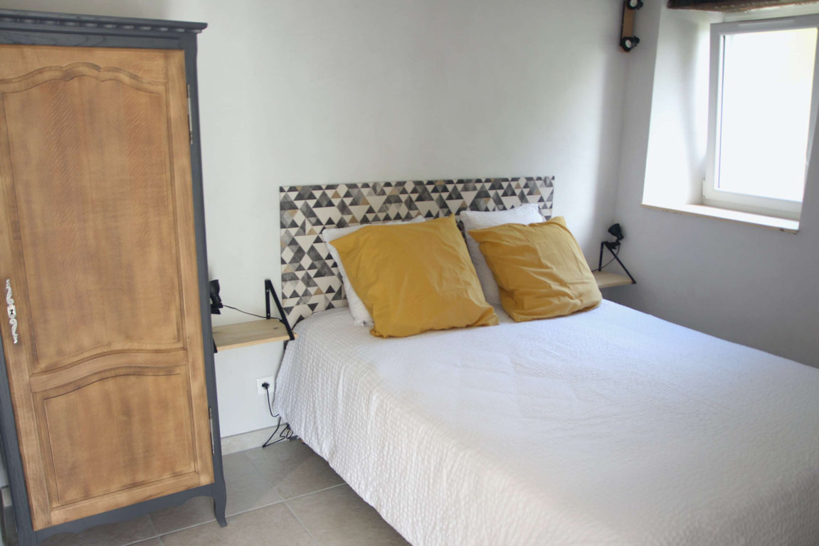 Chambre lumineuse, possédant une porte-fenêtre avec vue sur le jardin potager et l'immense laurier.