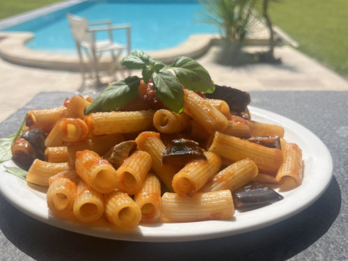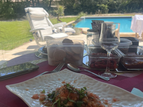 L’extérieur se compose d’une grande piscine à débordement et au sel, prolongée d’un abri où vous pouvez vous prélasser sur des transats, protégés du soleil tout en sirotant des boissons fraîches issues du réfrigérateur mis à votre disposition, douches et WC complètent l’agrément extérieur