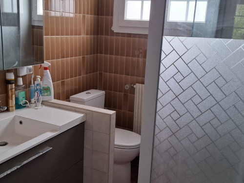 Salle de bain reservées aux hôtes : Meuble avec grand miroir et vasque et une douche à l'italienne avec siège et barre latérale et un WC rehaussé.