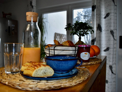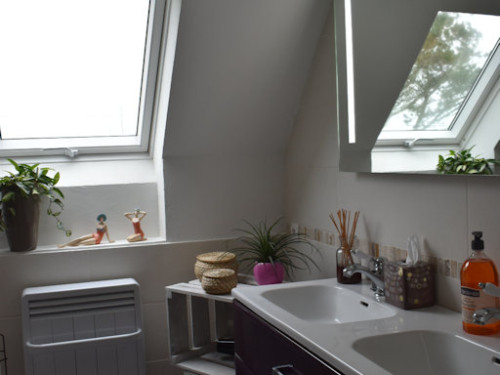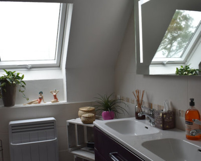Une salle d'eau avec une grande douche, 1 toilette et une double vasque. Articles de toilette fournis, sèche cheveux à disposition. Petit déjeuner compris.