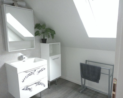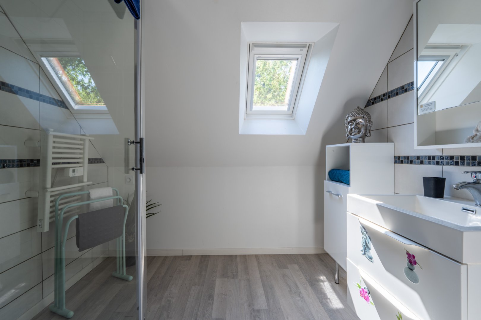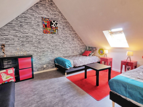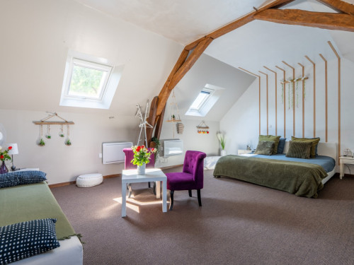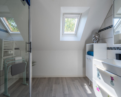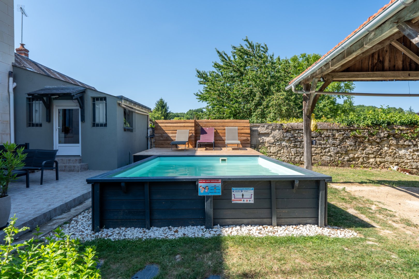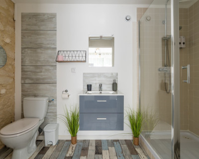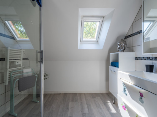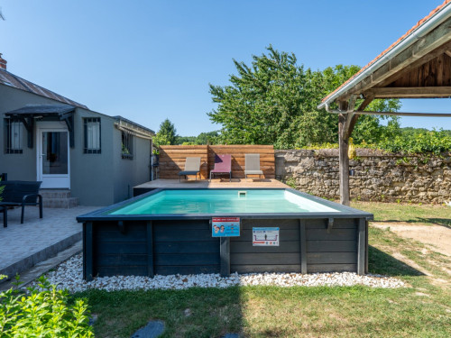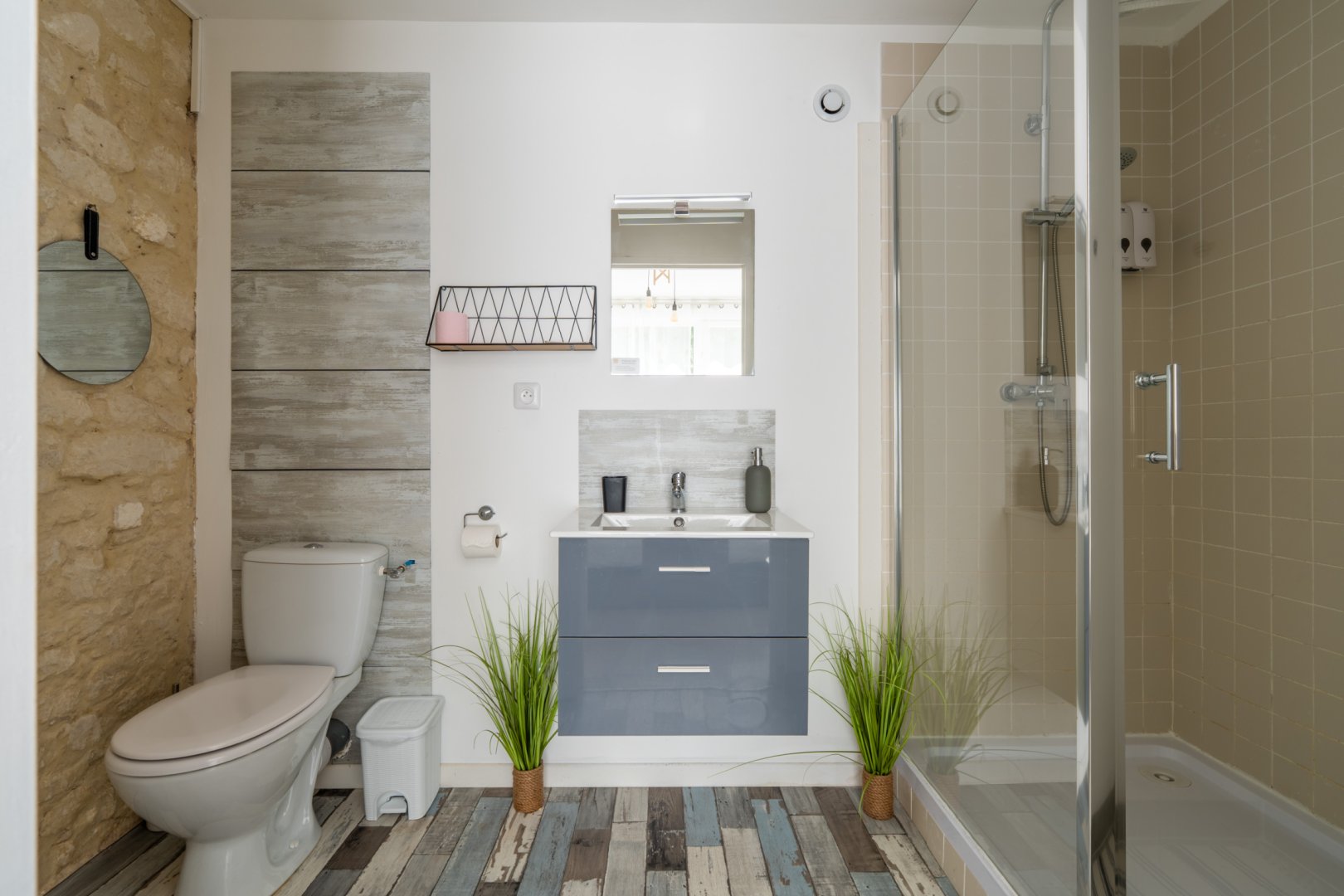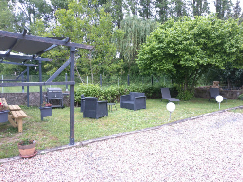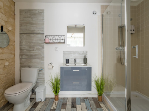 Vous disposez d'une salle de douche moderne avec toilettes séparées pour plus d'intimité. Depuis votre chambre, profitez d'une vue apaisante sur le jardin paysager. À l'extérieur, un espace aménagé avec aire de jeux salon de jardin , transat , table de picnic et piscine vous invite à la détente