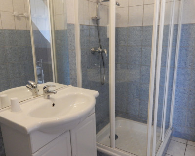 Cabinet de toilette équipé, lavabo, douche et WC. WC à l'hygiène moyen. Fond de la cuvette marron.
