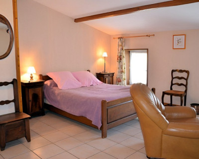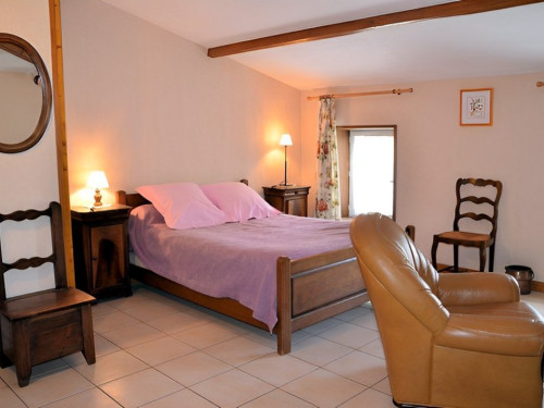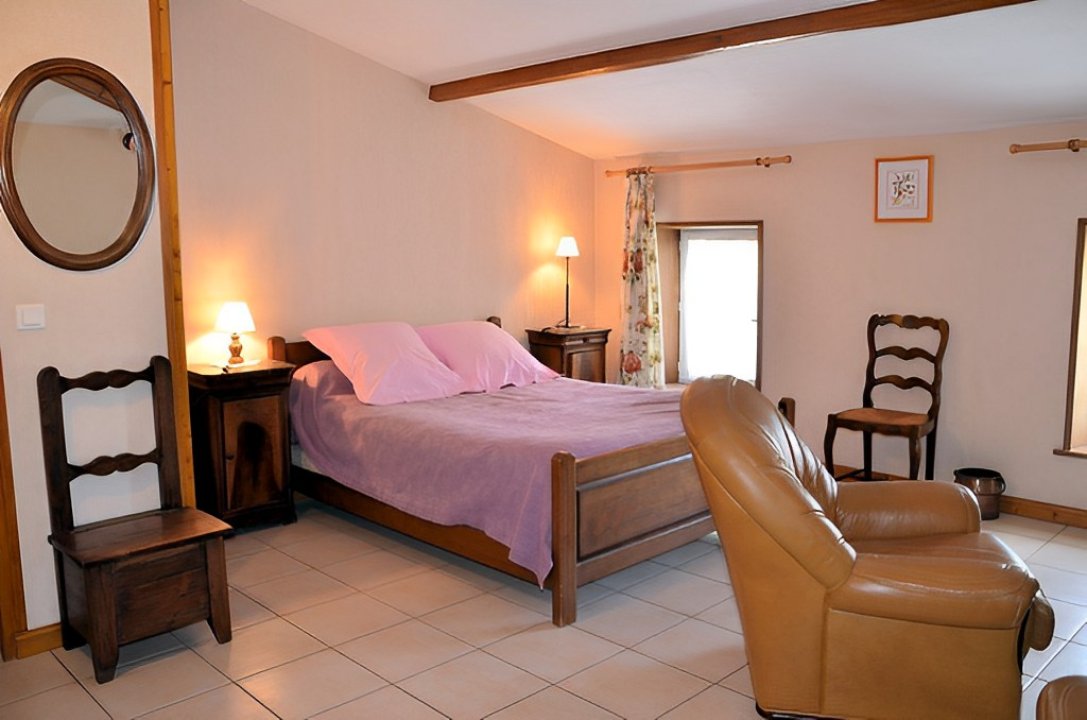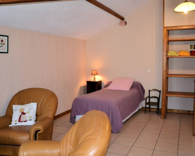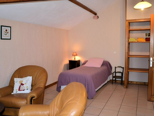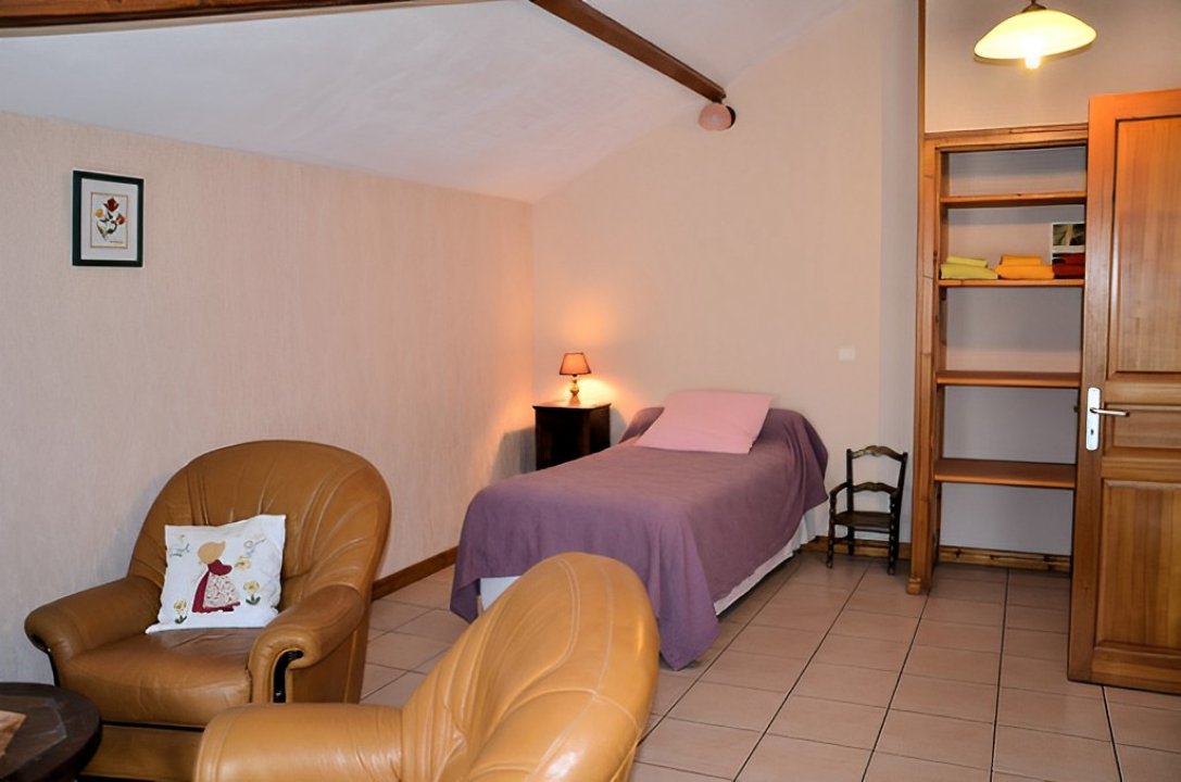 Deux fauteuils sont disposés dans la chambre à deux lits.