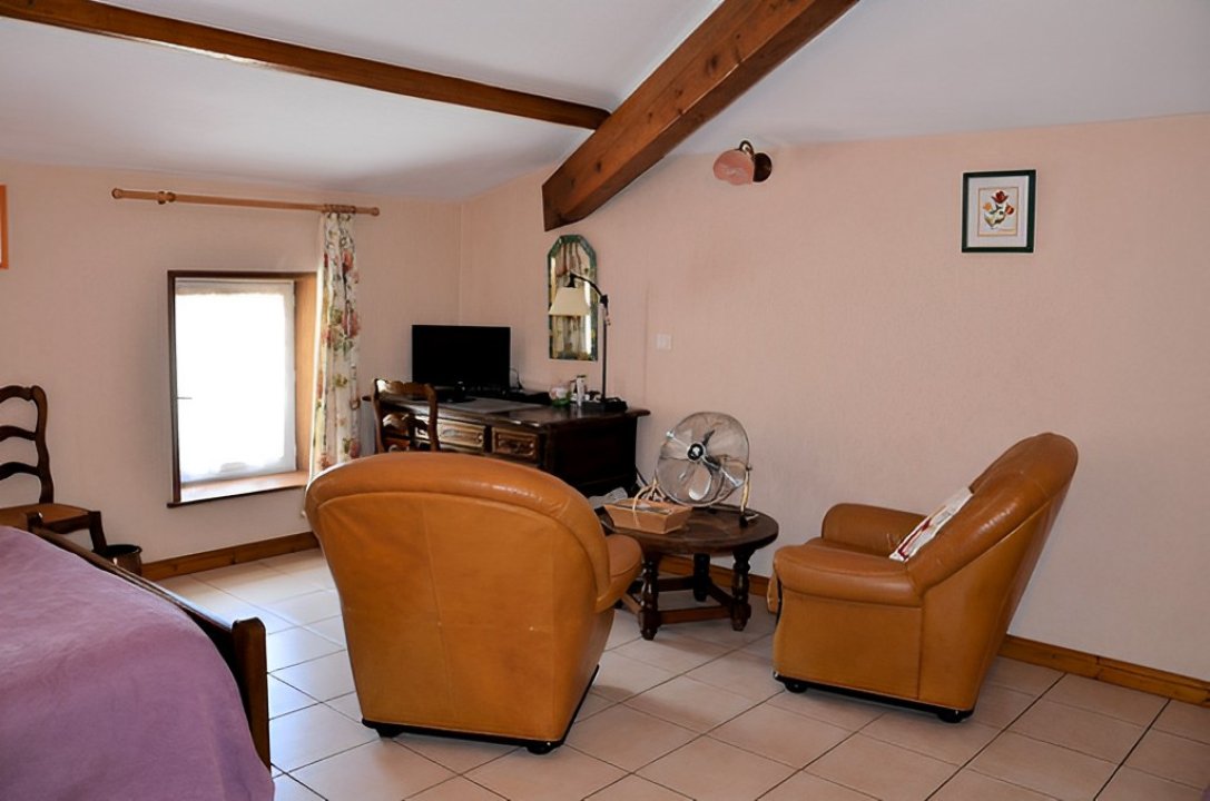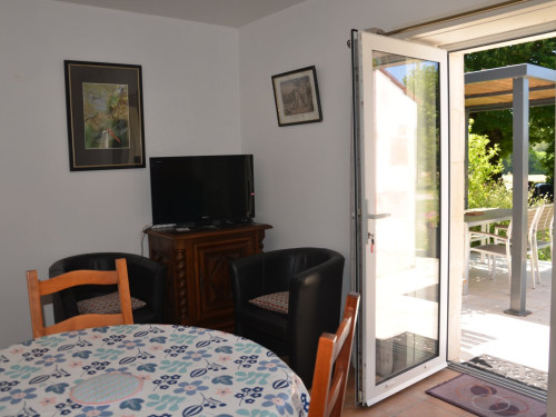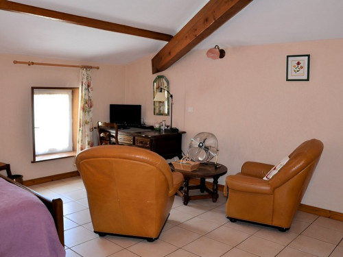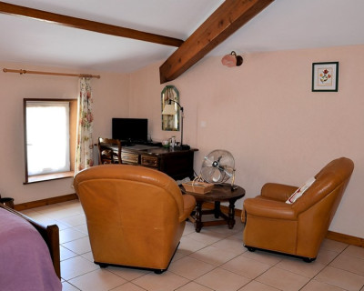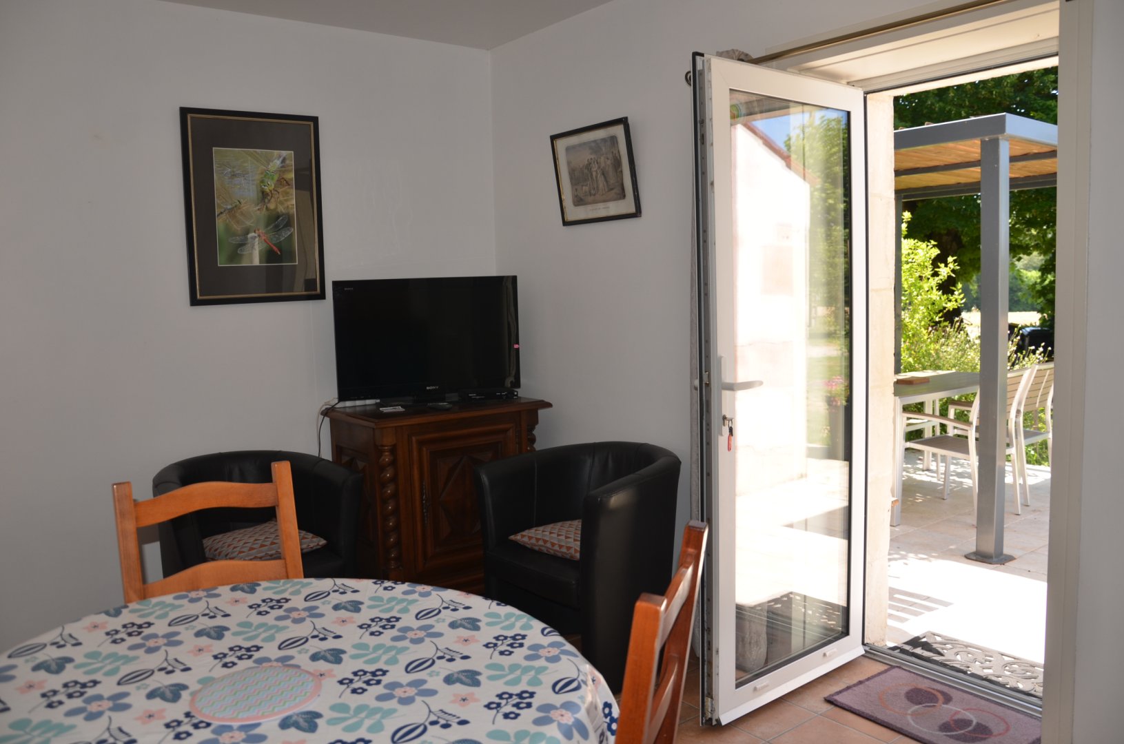 Deux autres fauteuils, une banquette, table ronde, quatre chaises, TV dans le petit séjour.