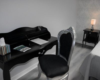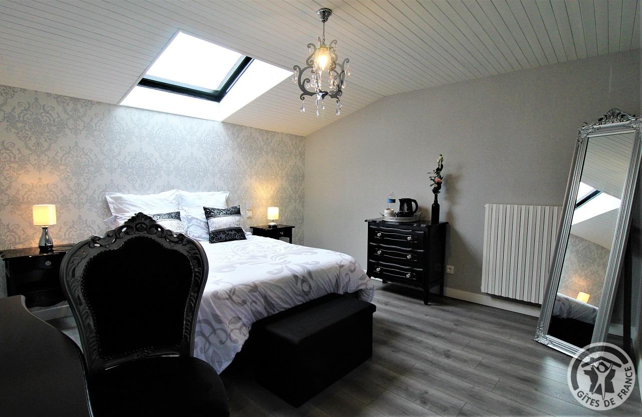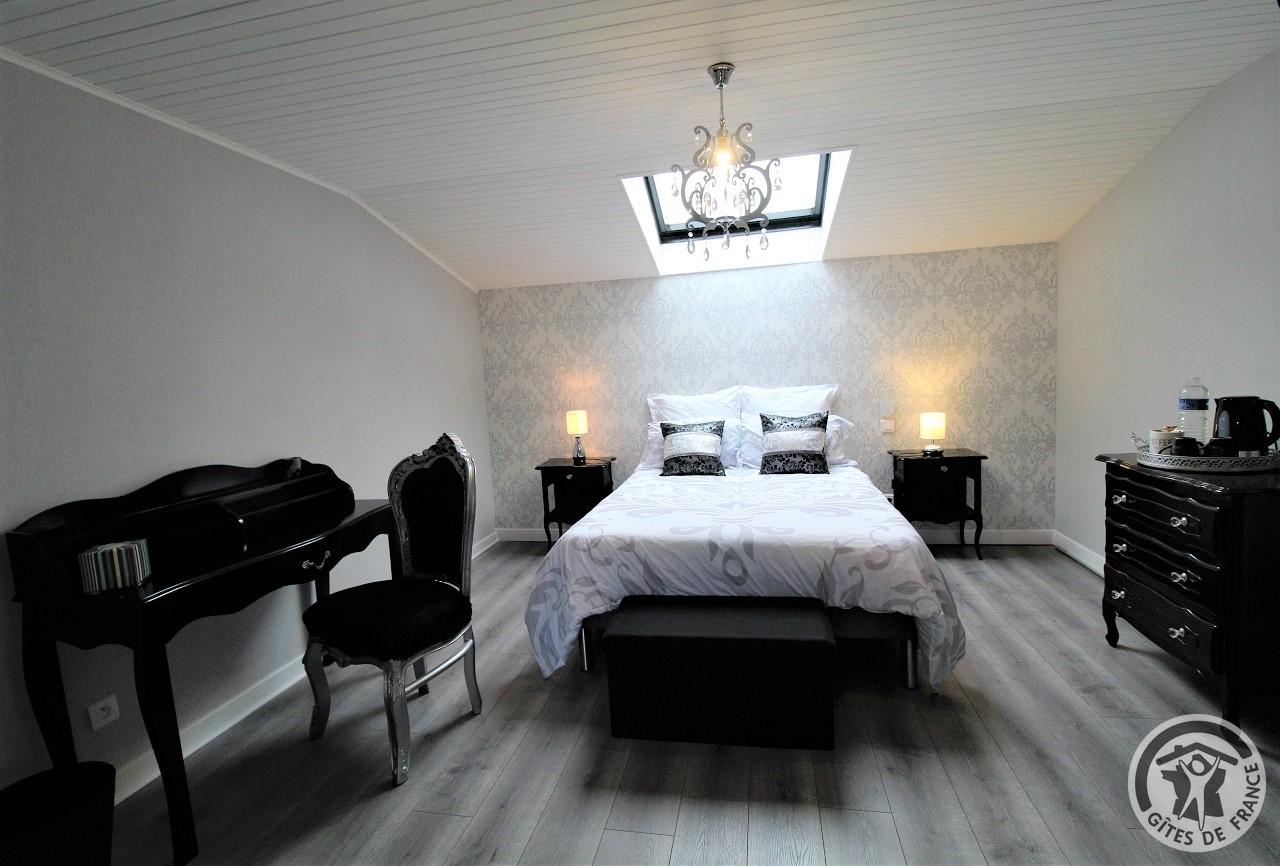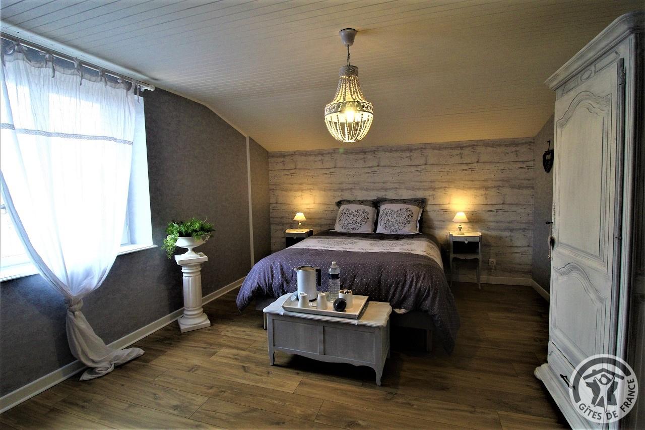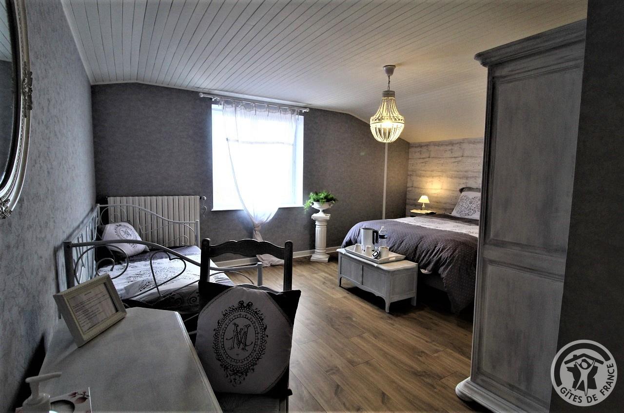 La Chambre "Houillette" peut accueillir 3 personnes dans un lit en 1.60 qui peut être séparé en 2 lits en 80, plus 1 lit en 90. Armoire (penderie, rayonnage), petite table/bureau, plateau de courtoisie. Accès à la salle d'eau par une porte coulissante (douche 90 X 1.40 ; lavabo et wc). 1 fenêtre avec volets bois, sol parquet. Possibilité lit d'appoint.