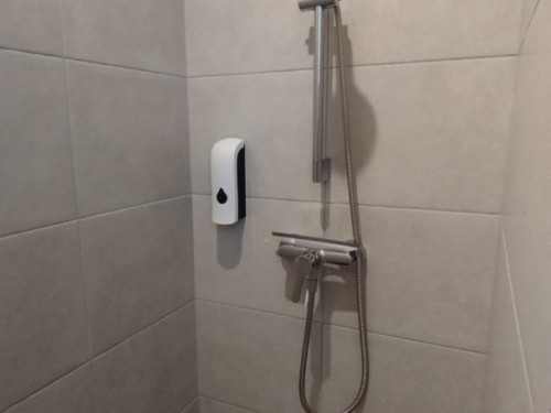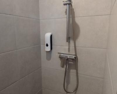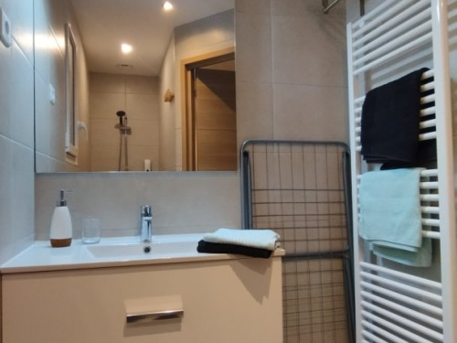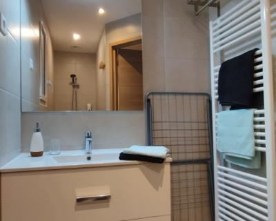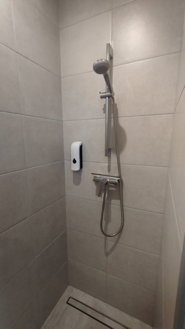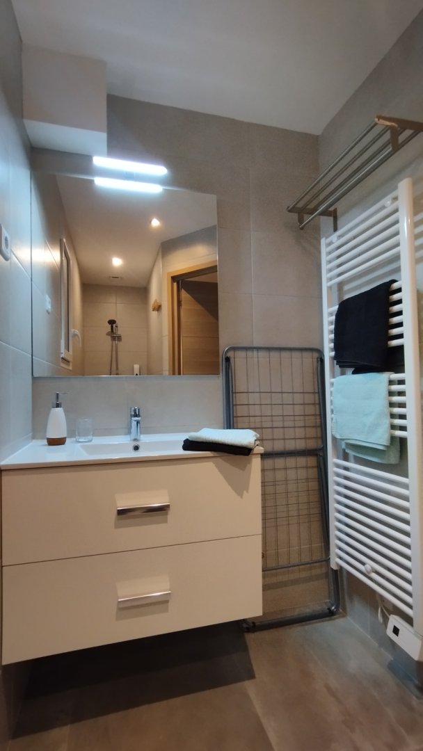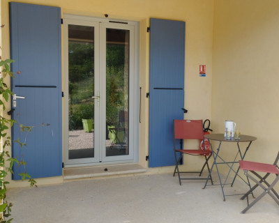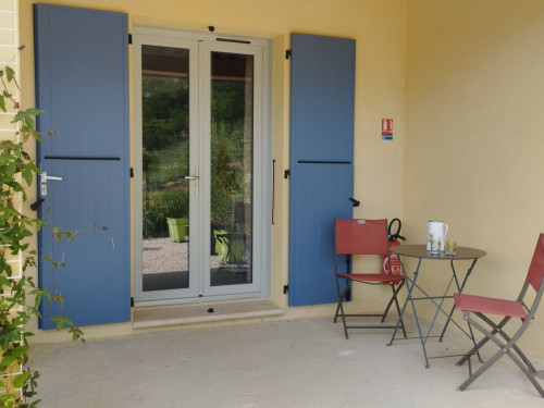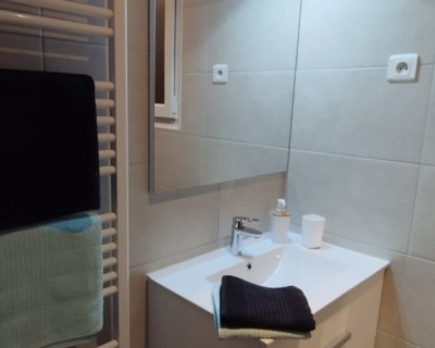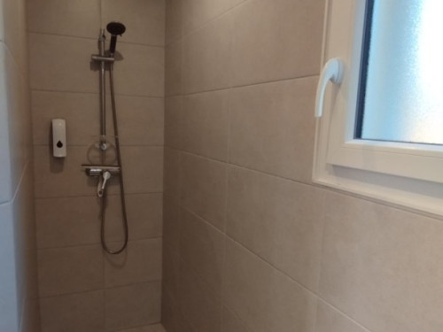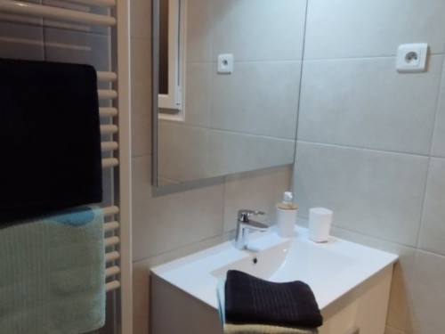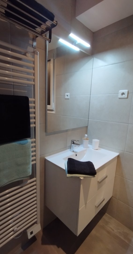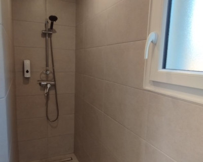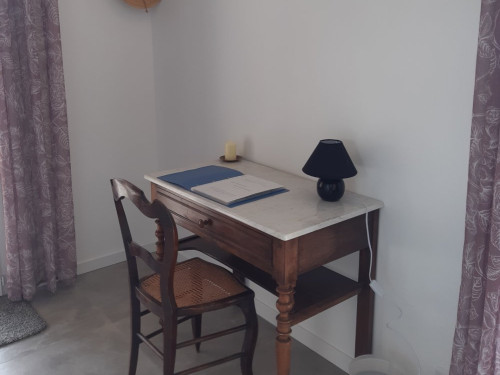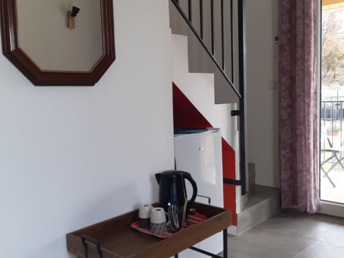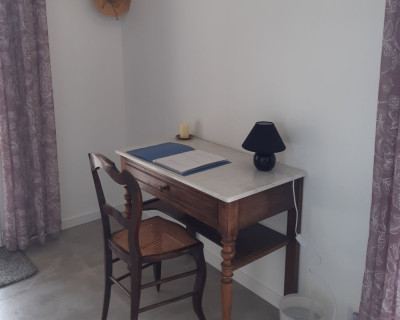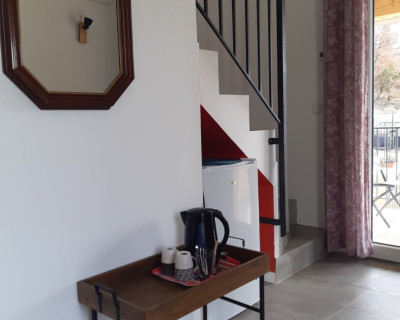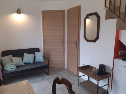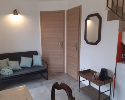 En rez-de-chaussée un coin salon avec une banquette-lit offrant un couchage de 120x190 et un bureau, une salle d’eau avec douche italienne et un WC séparé.