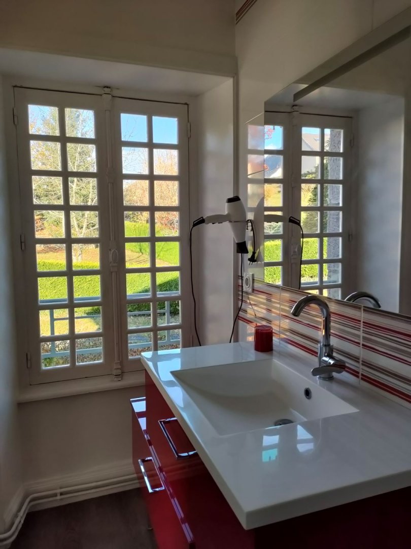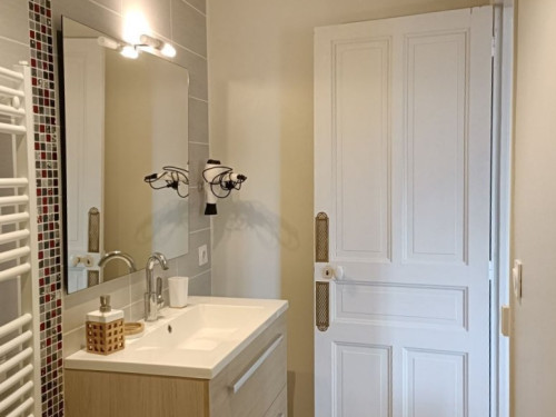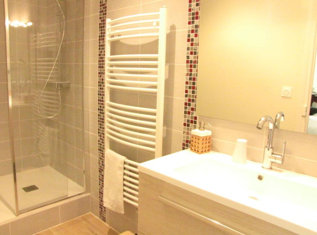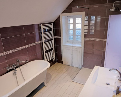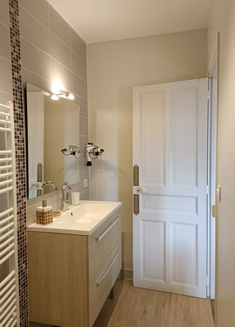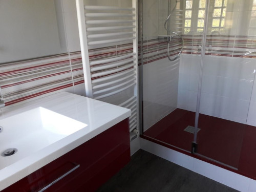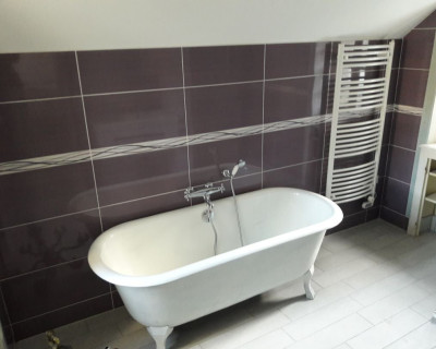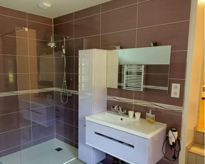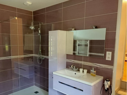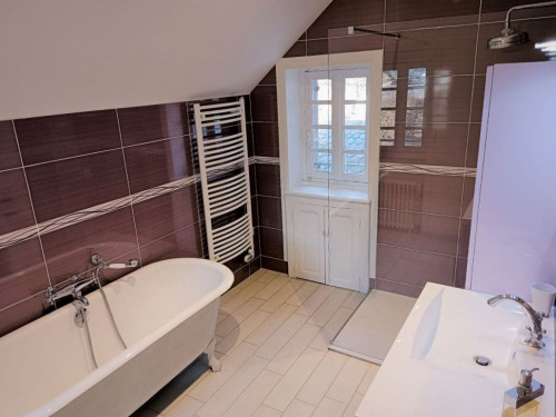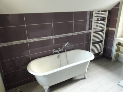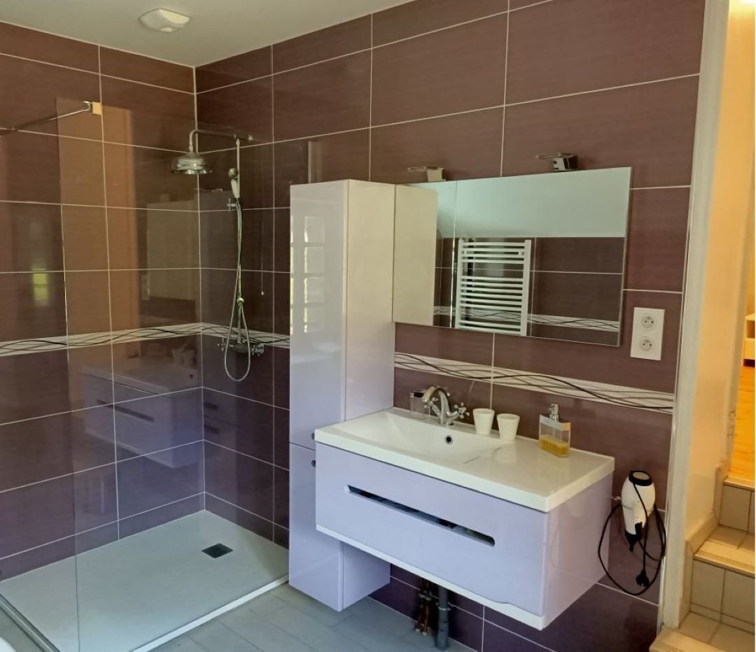 de la chambre on descend 2 marches pour aller à la salle de bains avec douche et baignoire ancienne. faïence murale couleur prune très sympa.