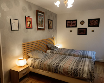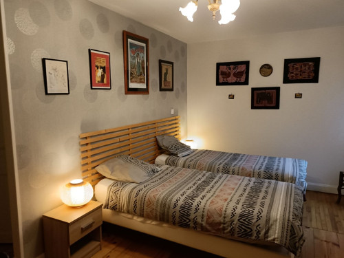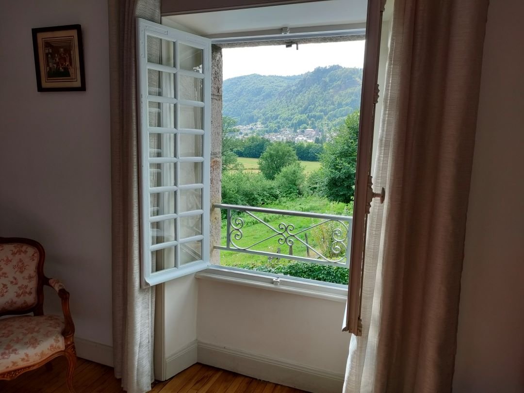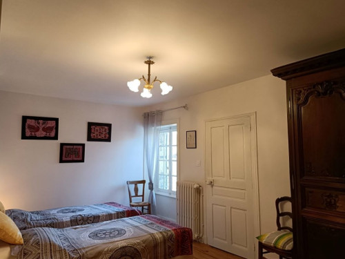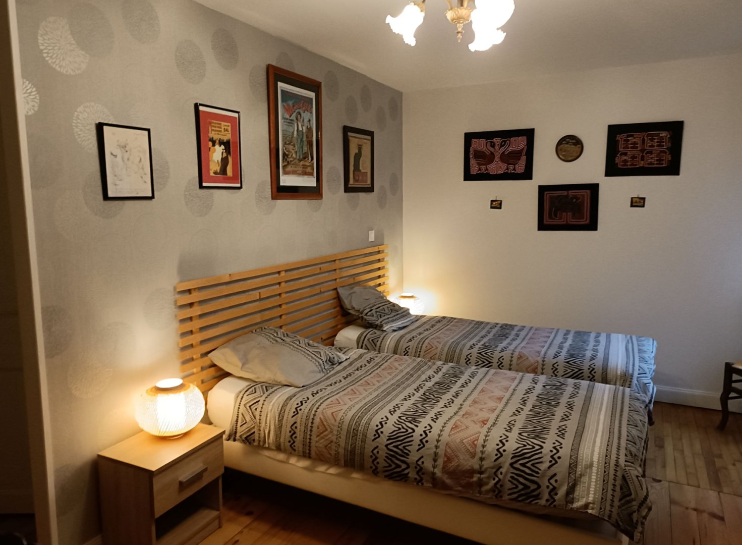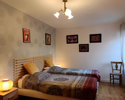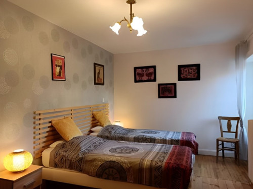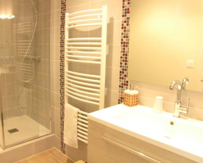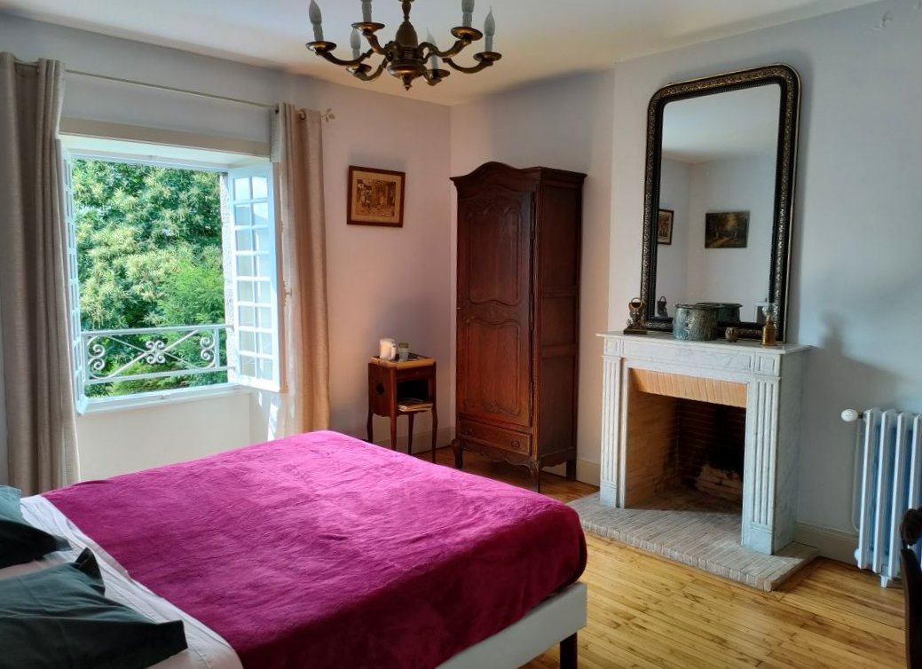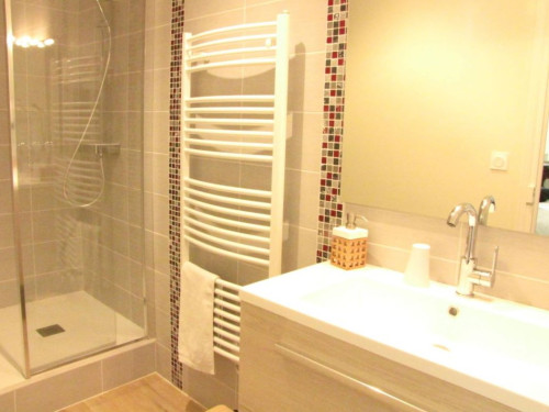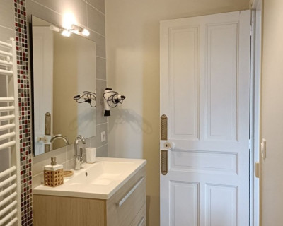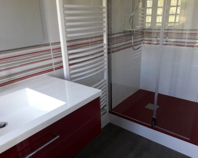 de la chambre on descend 2 marches pour aller à la salle de bains avec douche et baignoire ancienne. faïence murale couleur prune très sympa.