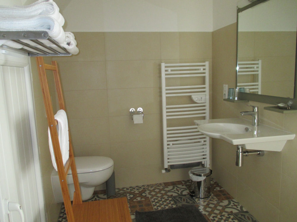 La salle de bain est équipée d'une douche à l'italienne, de WC suspendu et d'un lavabo avec un grand miroir.