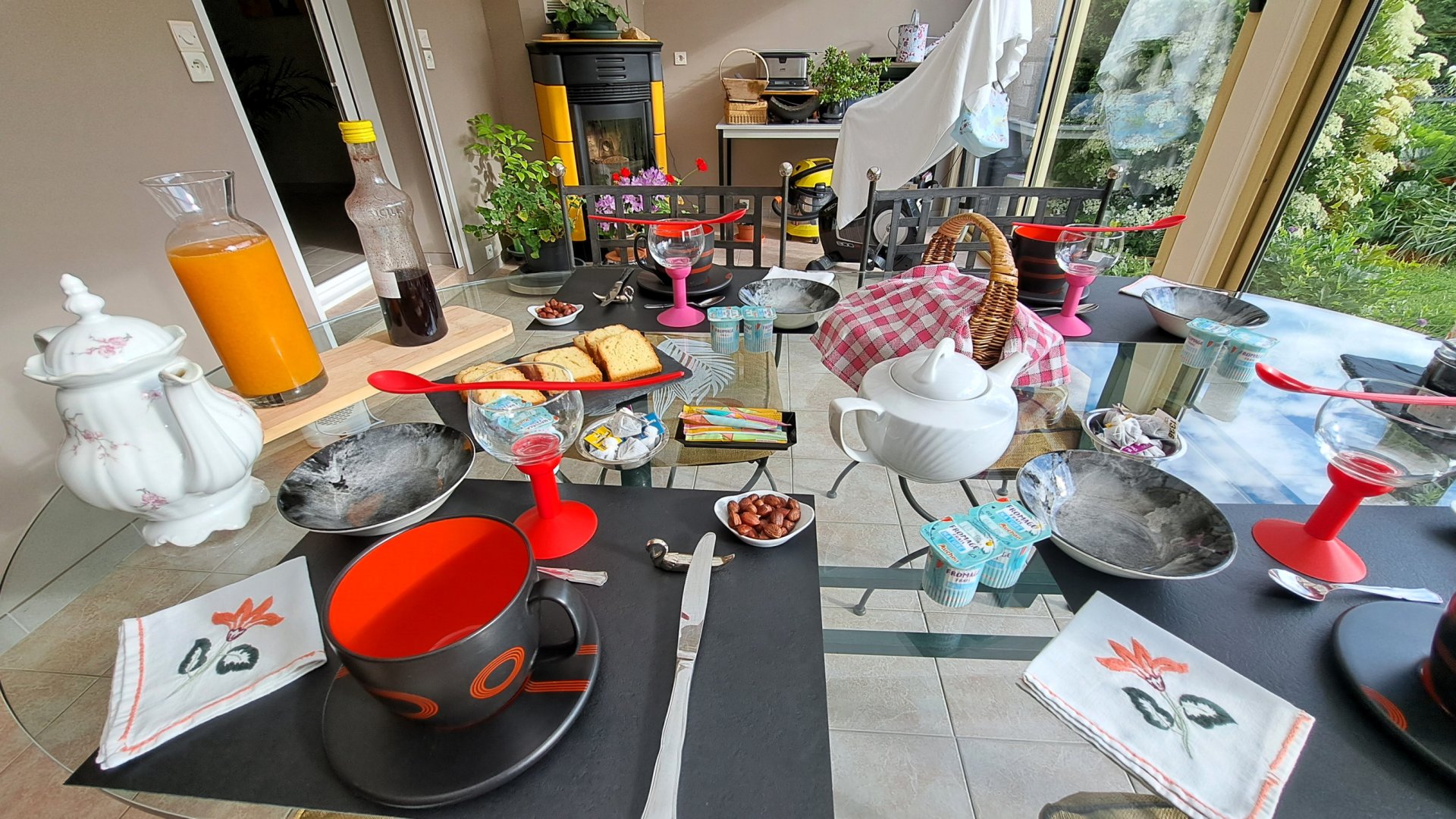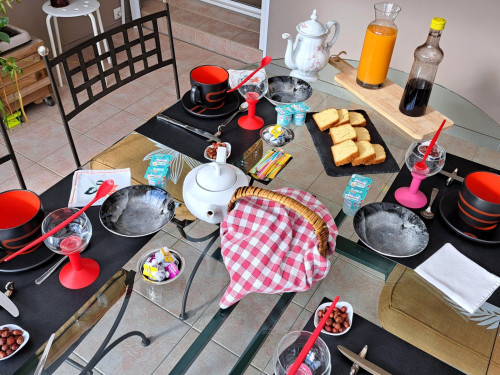 À votre disposition : un salon, un espace repas avec micro-ondes, bouilloire, vaisselle, mange-debout, chaises hautes, penderie. Je mets à disposition ma cuisine pour les personnes qui souhaitent préparer leur repas.