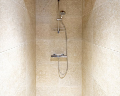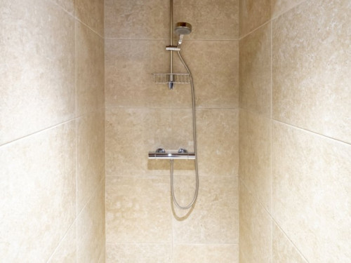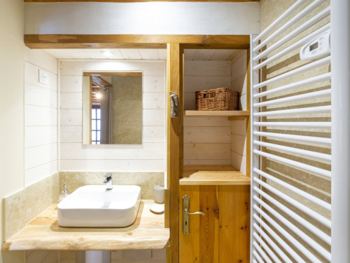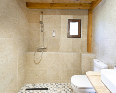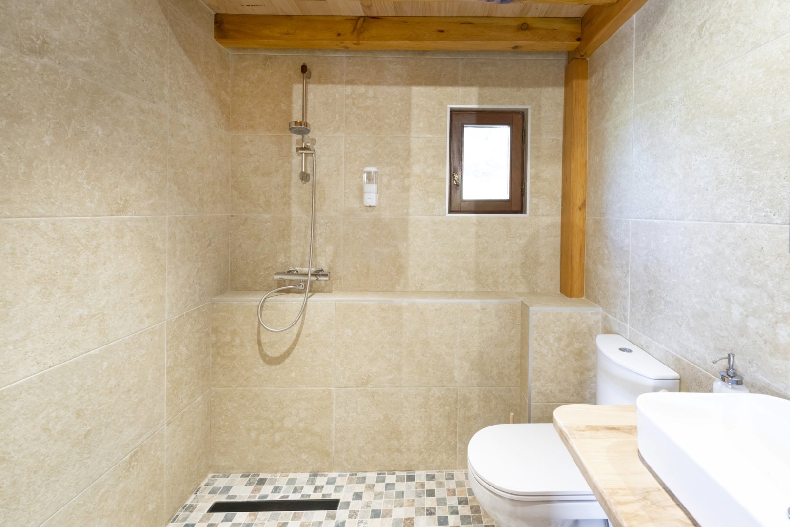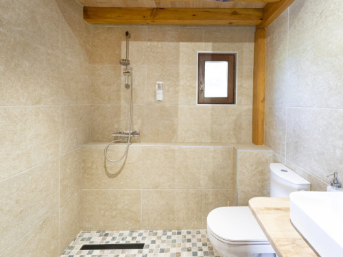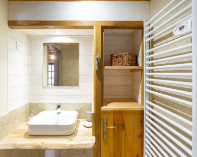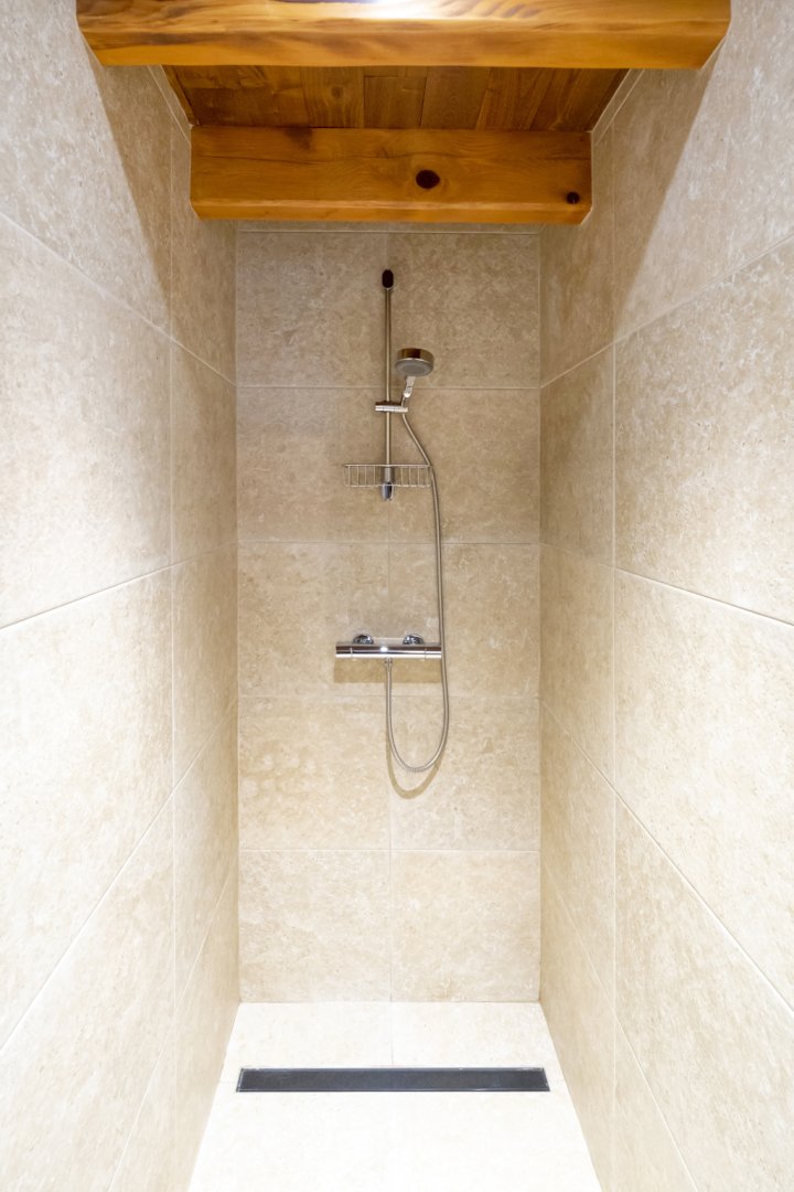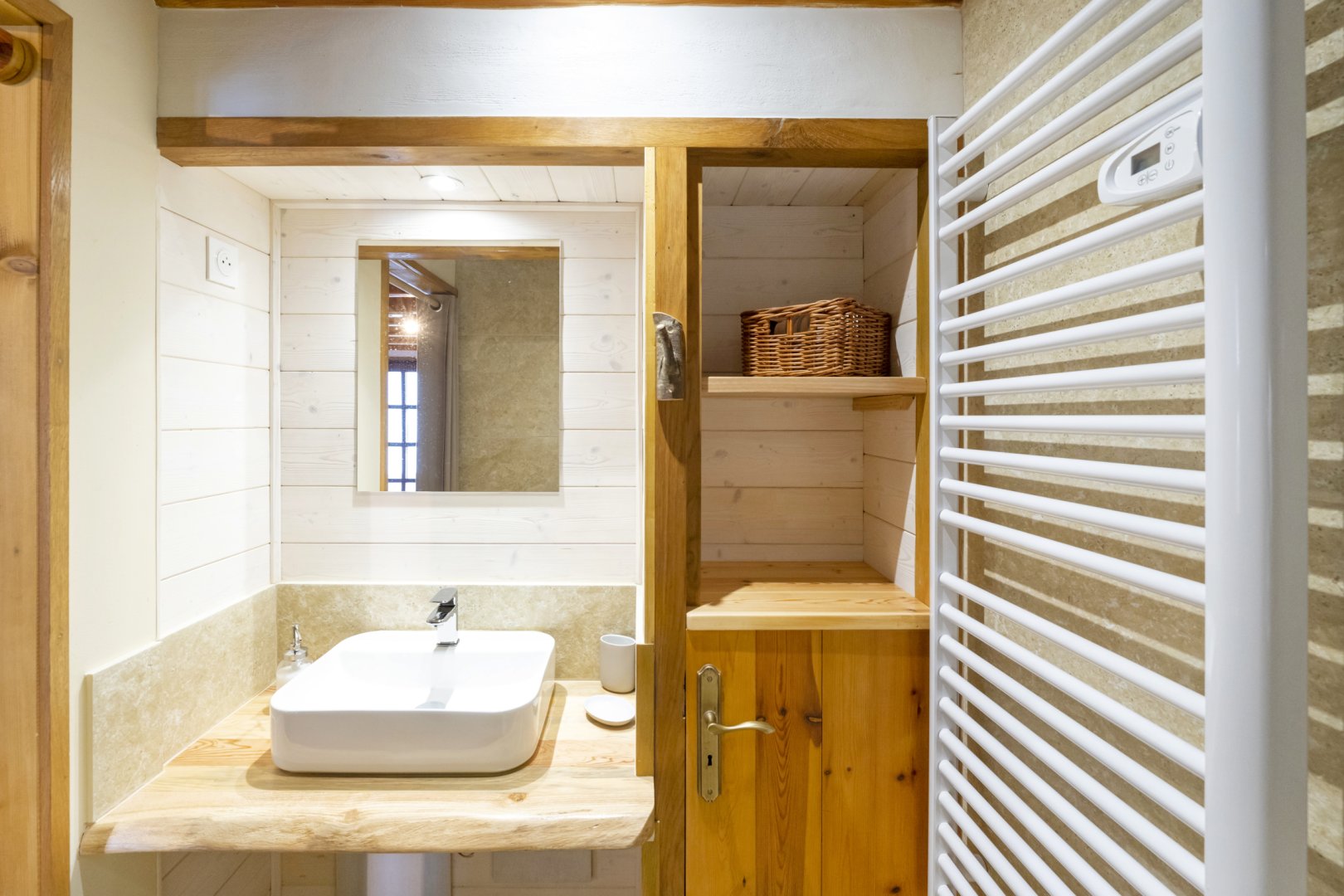 - une salle de bain avec douche à l’italienne, sèche-cheveux, sèche serviette