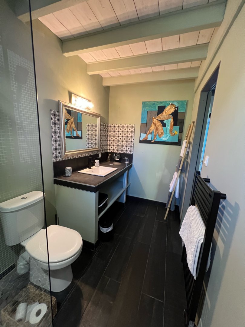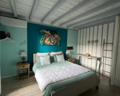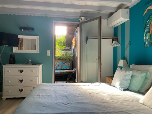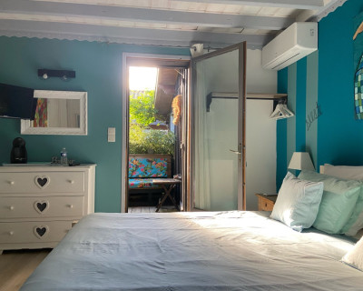 L'heure bleue porte bien son nom, avec des tons d été turquoise et blanc. Les toilettes sont séparées de la salle d’eau, terrasse privative avec vue sur les bambous.