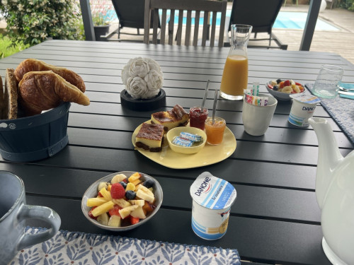 Les petits déjeuners sont servis dans la chambre ou sur la terrasse face au jardin et à la piscine. Un accès Wifi vous permet de rester connectés.