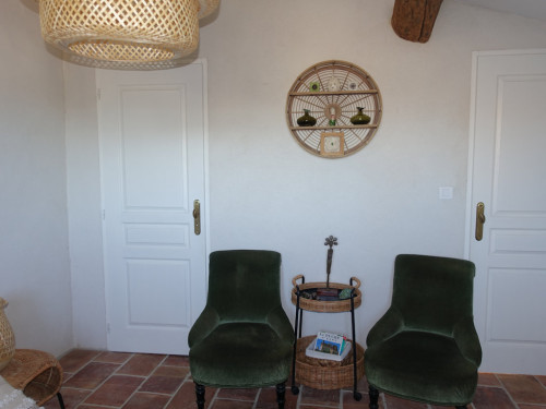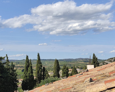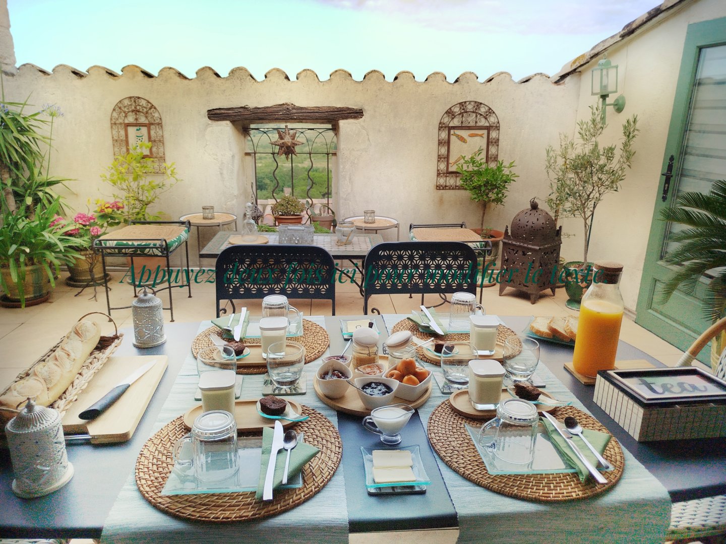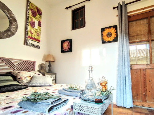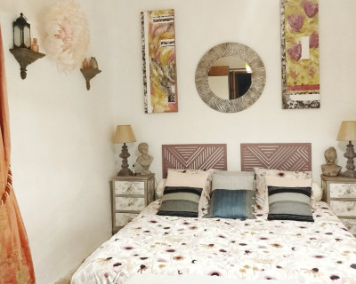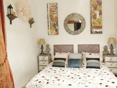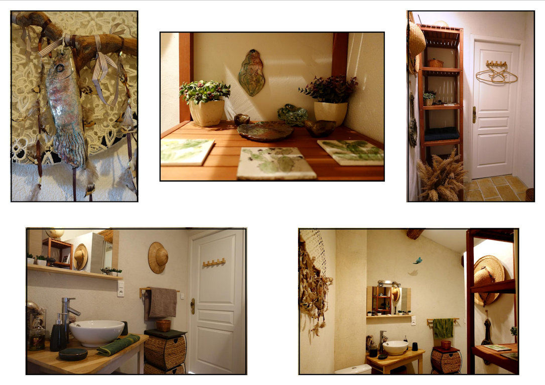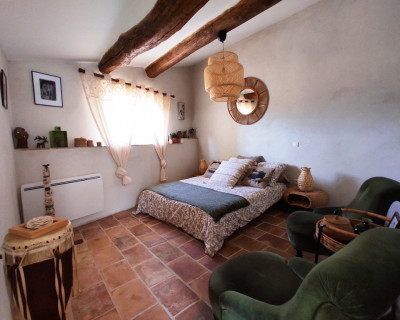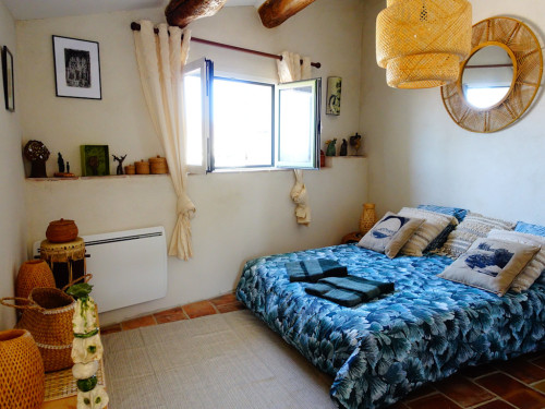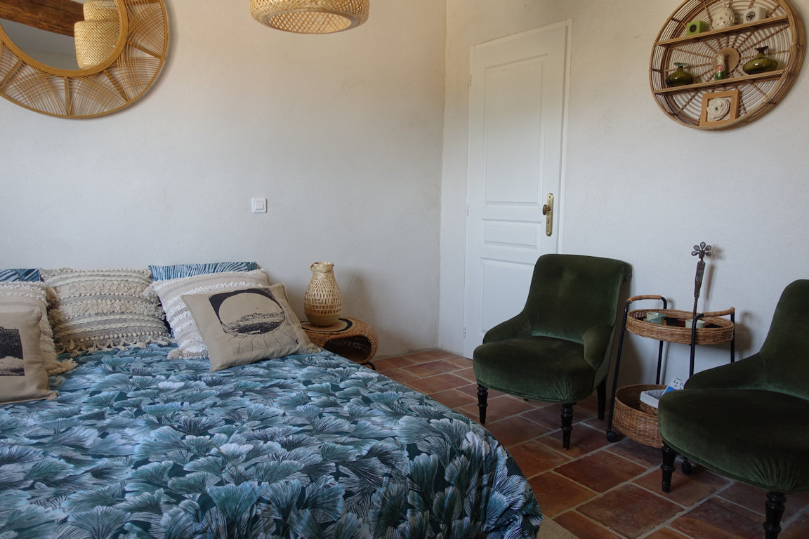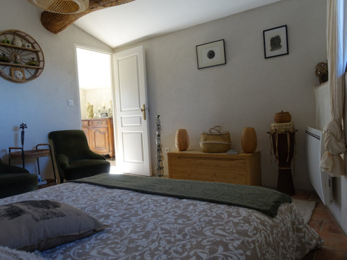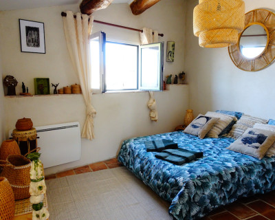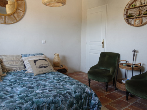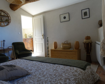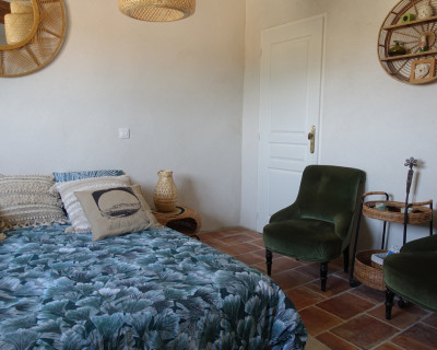 Un grand lit en 160 et un coin repos avec 2 fauteuils cosy. Salle d'eau privative avec tout le nécessaire. Un plateau de courtoisie vous est offert. - Deux belles tropéziennes sont à votre disposition. Une en partie couverte avec un coin cuisine : frigo, micro-ondes, bouilloire, machine à café, plaque de cuisson et vaisselles. Un espace détente transats, fauteuils, parasol et surtout une vue magnifique le soir vous pouvez admirer le coucher de soleil ou rêver devant le ciel étoilé. Un salon partagé avec l'hôte, coin bureau lecture et télé. De nombreux jeux et livres. Possibilité de table d'hôtes sur réservation. Pour les motos ou vélos, un garage est disponible. Pour les voitures un parking à côté. Je serais heureuse de vous parler de notre belle région. Cette chambre domine par sa vue les vignes et la garrigue et vous transporte dans un univers exotique et artistique. Sa décoration est soignée avec des objets d'artistes et de créateurs, vous invite au voyage. Un grand lit en 160 confortable pour des nuits au calme. Salle d'eau privative serviettes, sèche cheveux et gel douche fournis. Plateau de courtoisie offert. Machine à café bouilloire ... à disposition