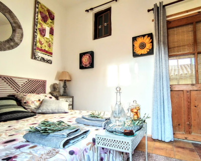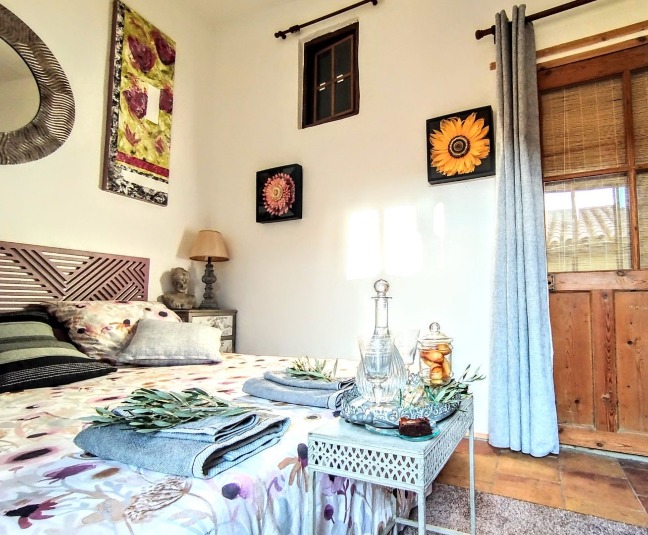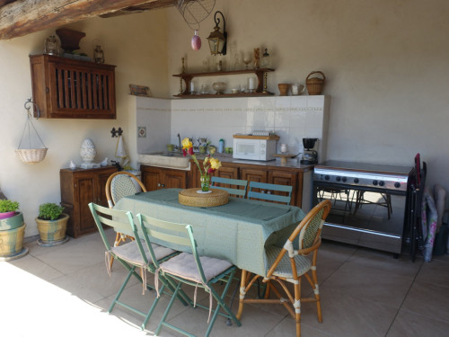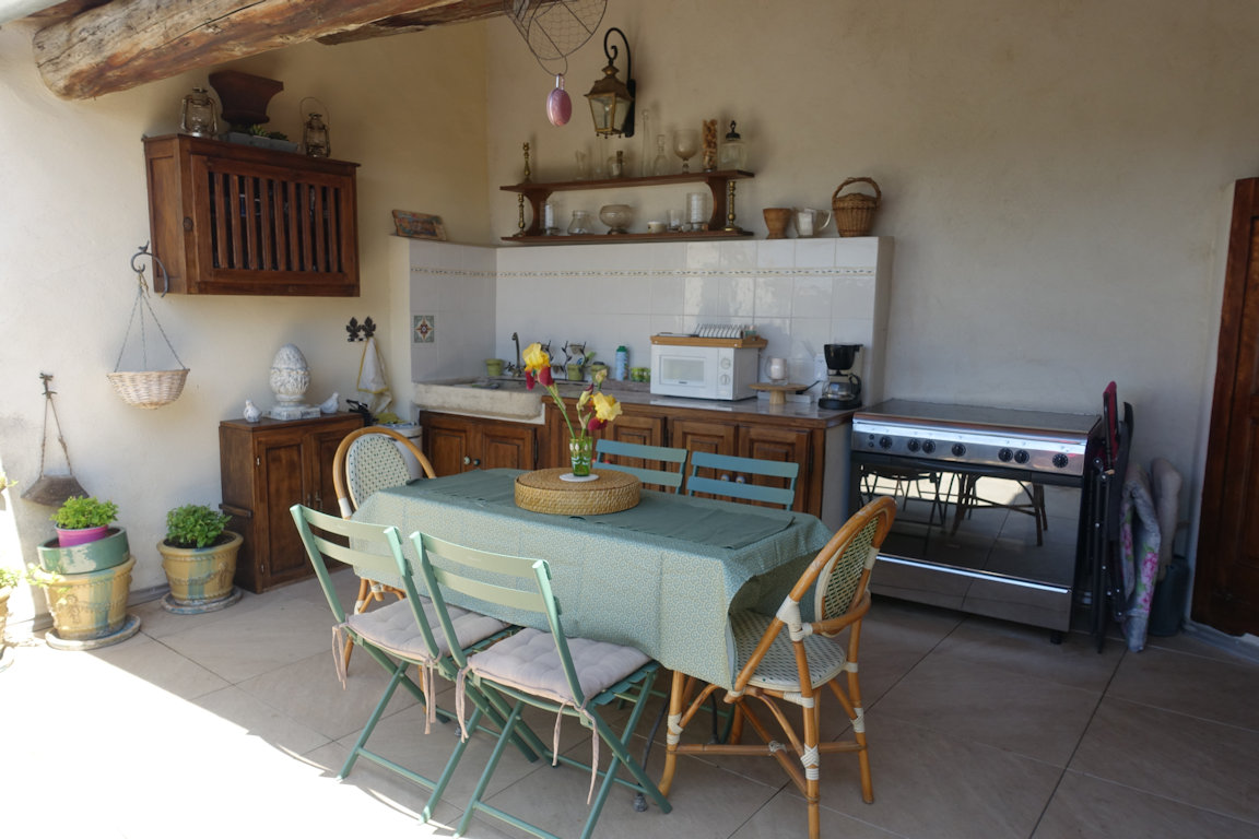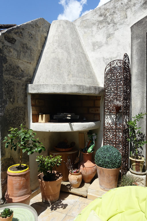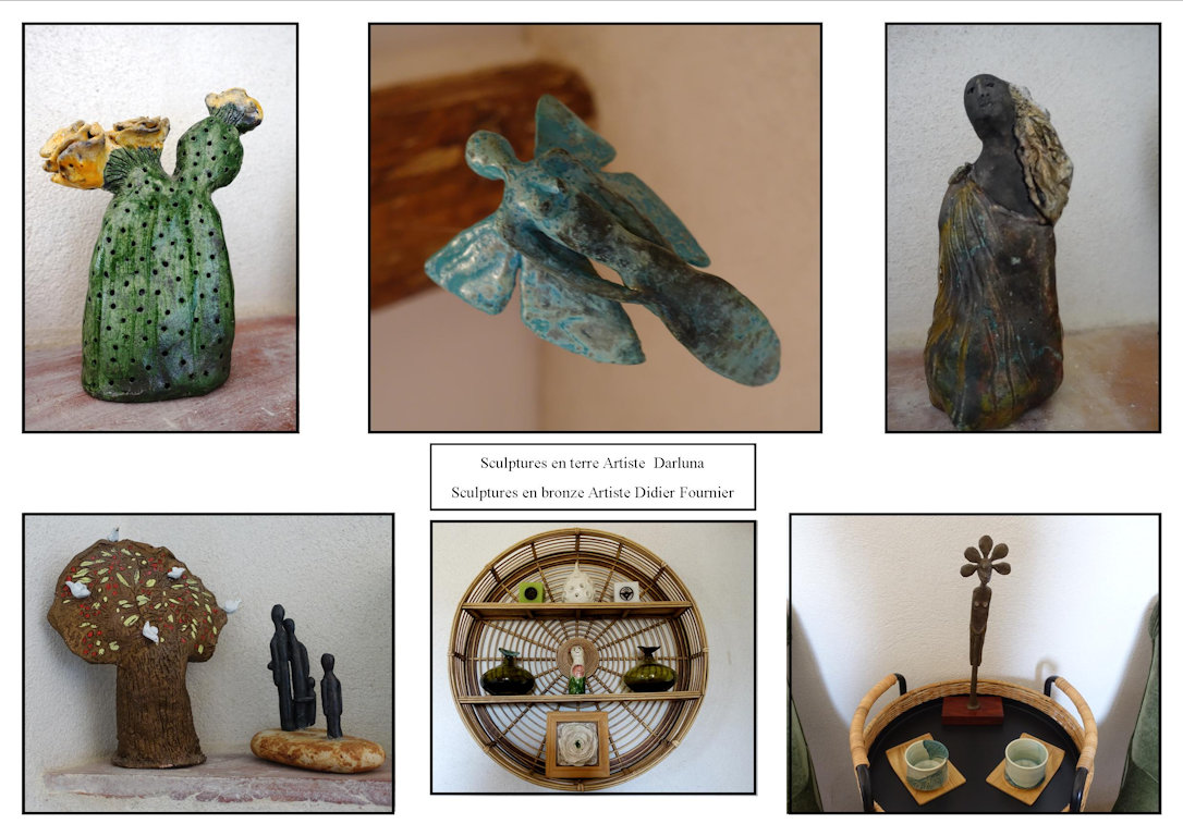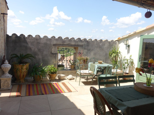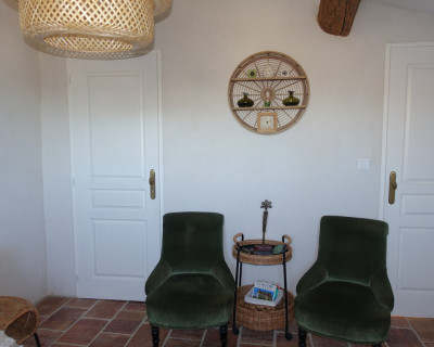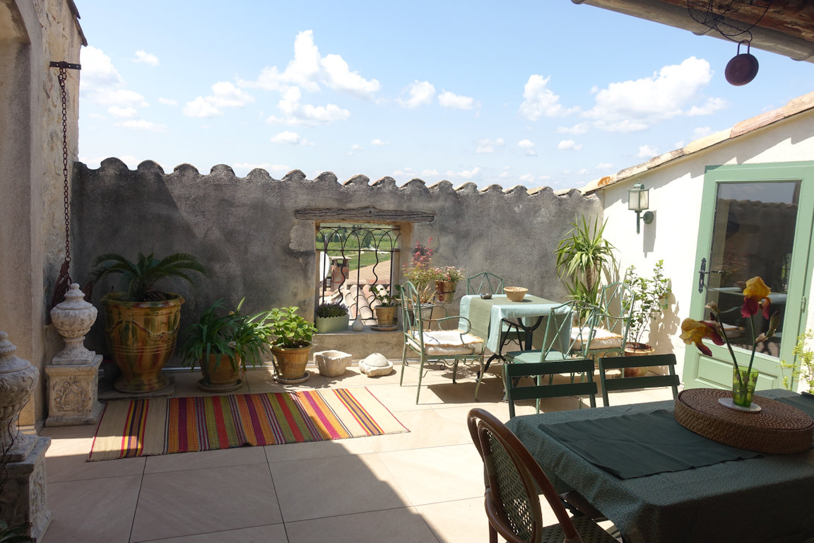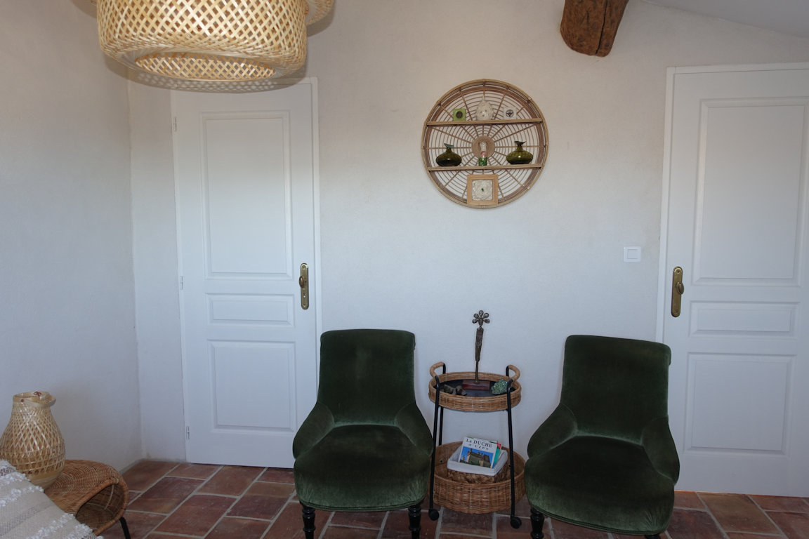 Un grand lit en 160 et un coin repos avec 2 fauteuils cosy. Salle d'eau privative avec tout le nécessaire. Un plateau de courtoisie vous est offert. - Deux belles tropéziennes sont à votre disposition. Une en partie couverte avec un coin cuisine : frigo, micro-ondes, bouilloire, machine à café, plaque de cuisson et vaisselles. Un espace détente transats, fauteuils, parasol et surtout une vue magnifique le soir vous pouvez admirer le coucher de soleil ou rêver devant le ciel étoilé. Un salon partagé avec l'hôte, coin bureau lecture et télé. De nombreux jeux et livres. Possibilité de table d'hôtes sur réservation. Pour les motos ou vélos, un garage est disponible. Pour les voitures un parking à côté. Je serais heureuse de vous parler de notre belle région. Cette chambre domine par sa vue les vignes et la garrigue et vous transporte dans un univers exotique et artistique. Sa décoration est soignée avec des objets d'artistes et de créateurs, vous invite au voyage. Un grand lit en 160 confortable pour des nuits au calme. Salle d'eau privative serviettes, sèche cheveux et gel douche fournis. Plateau de courtoisie offert. Machine à café bouilloire ... à disposition