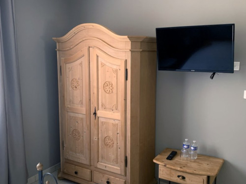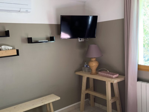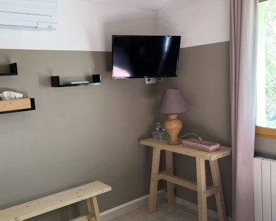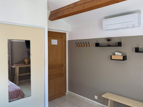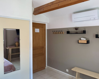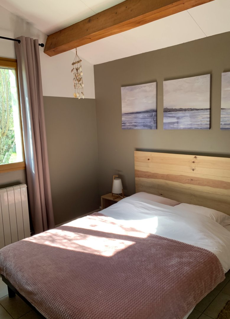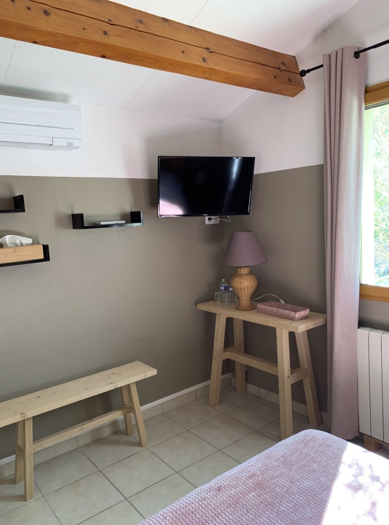 2) la chambre "Parme" - toute mignonne avec ses poutres apparentes - 12 m² située au 1er étage - à côté de la salle de bain - TV - climatisation - vue sur la terrasse arrière de la maison - lit 140x190 - Armoire penderie.