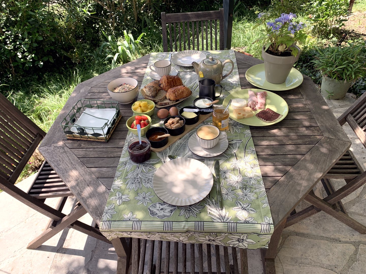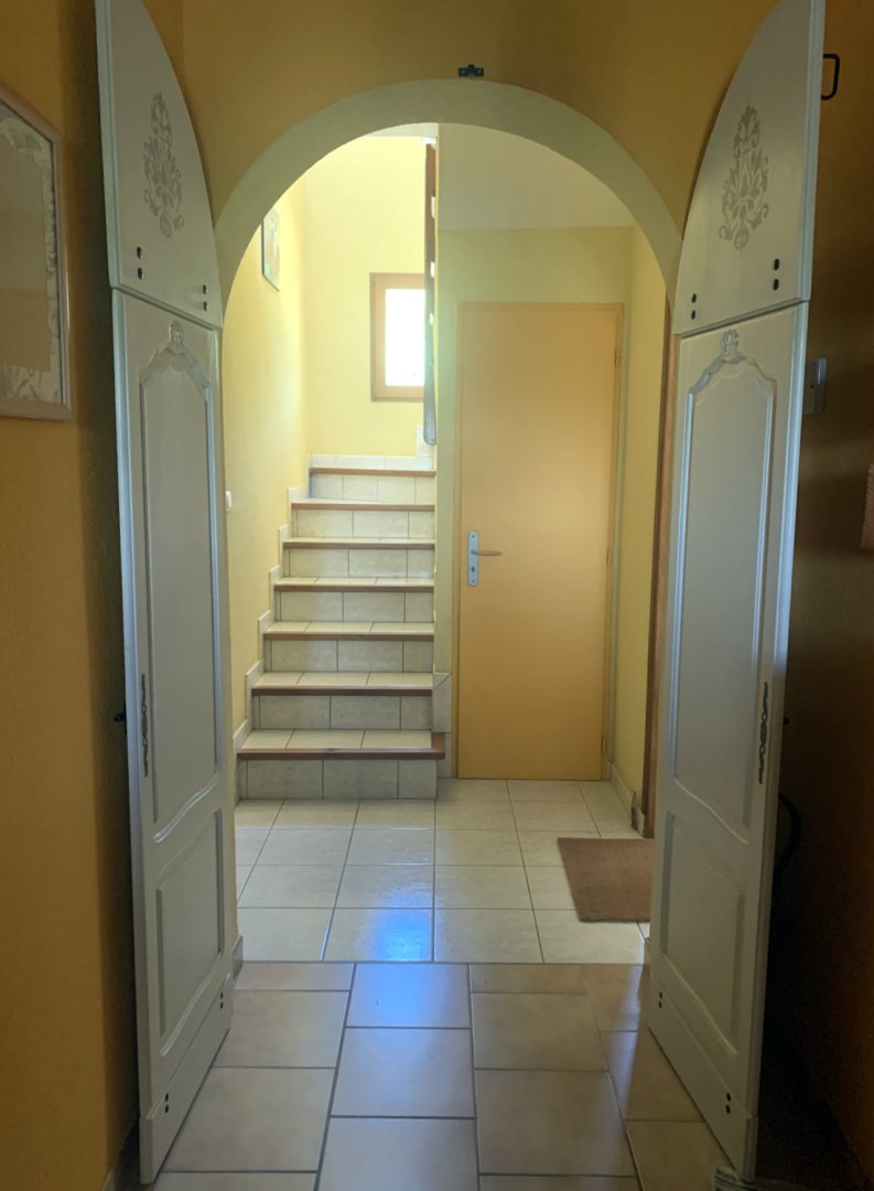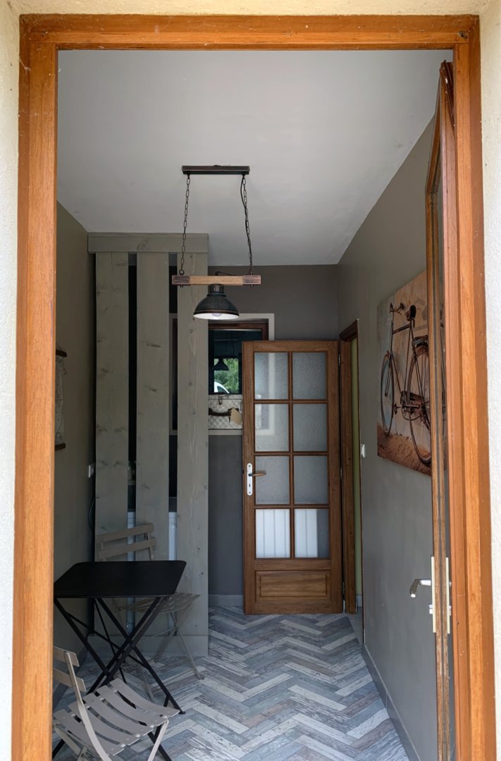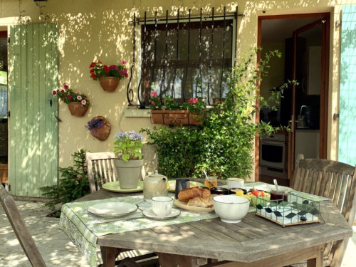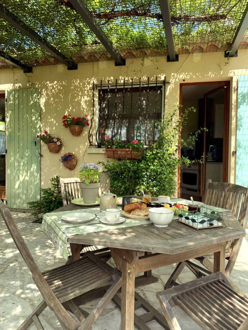 Pour le petit déjeuner, une porte voûtée donne accès au reste de notre maison (voir photo). Nous vous accueillerons, soit dans notre salle à manger si les températures sont fraîches, ou alors sur notre terrasse, voir photos du petit déjeuner.