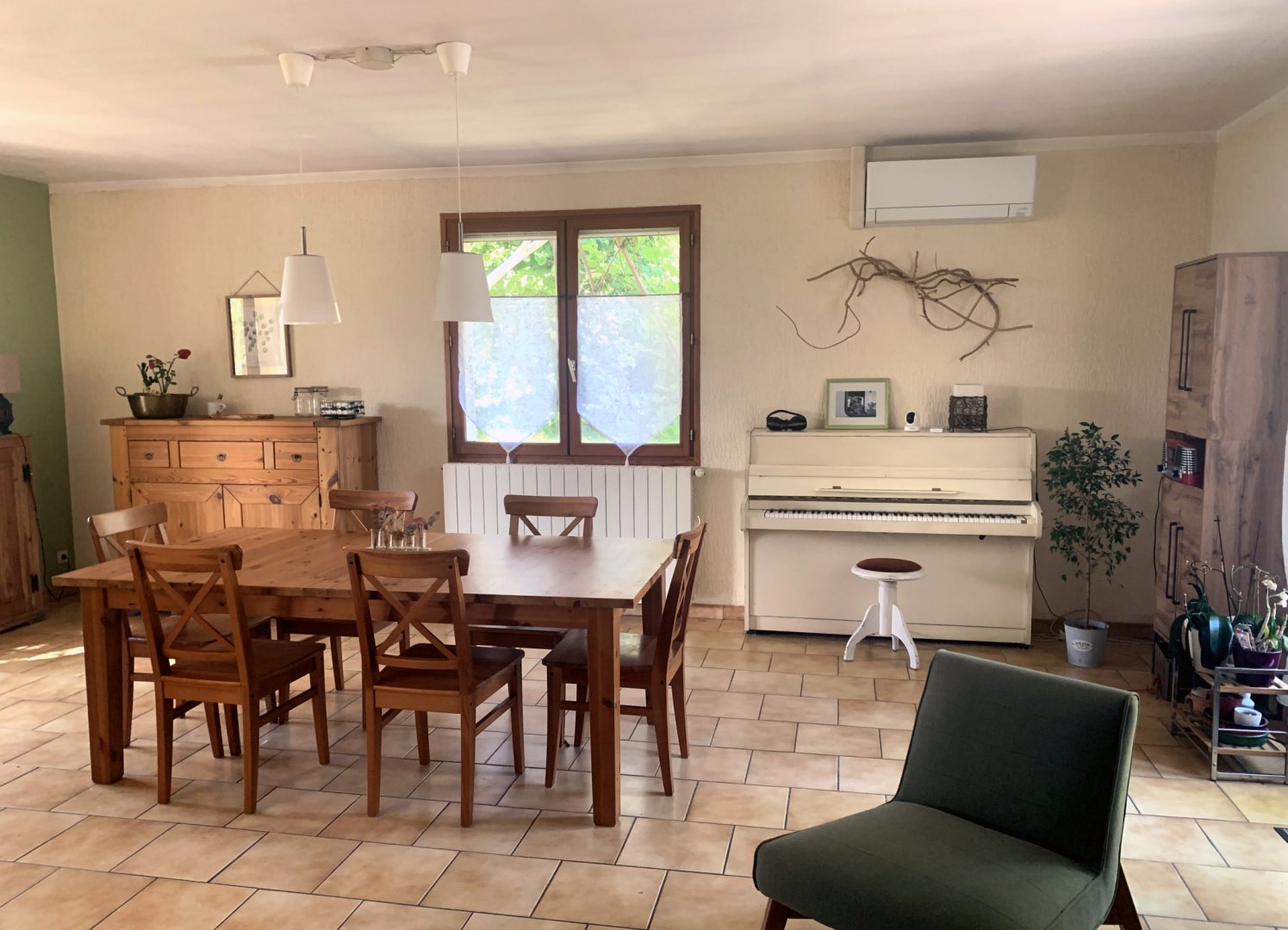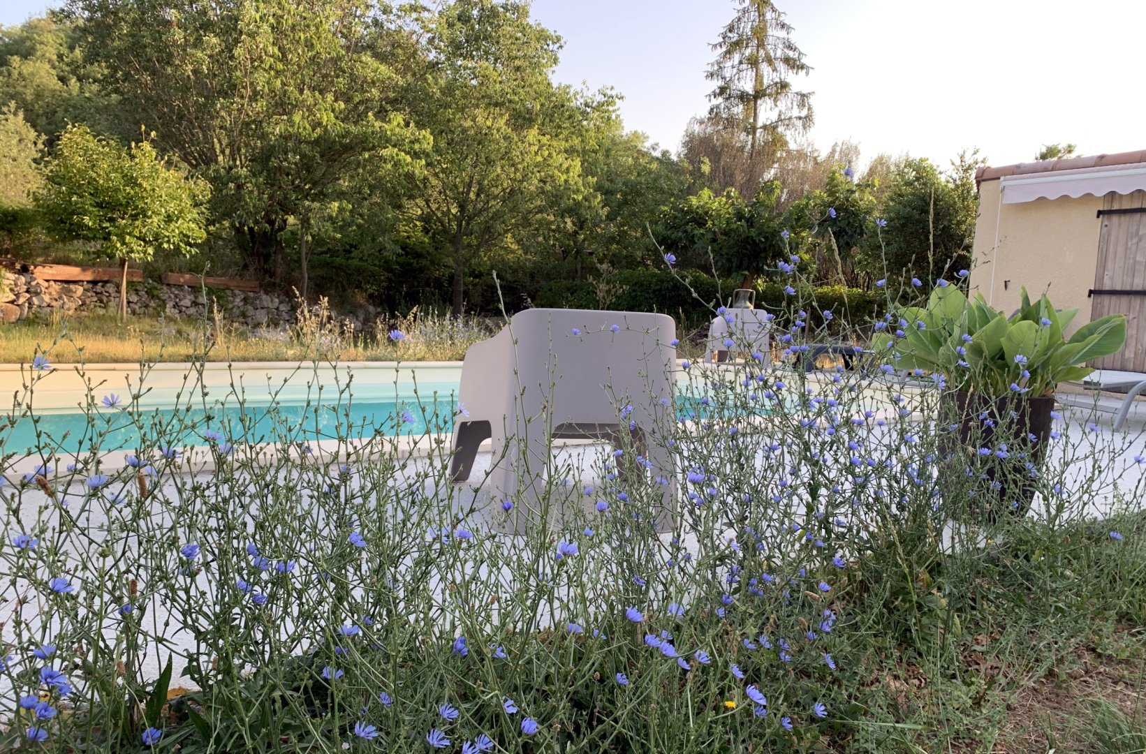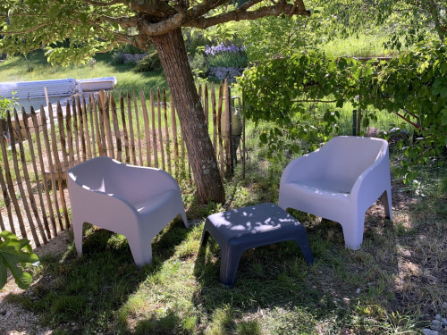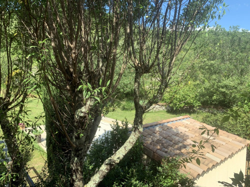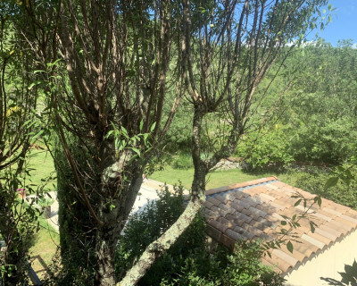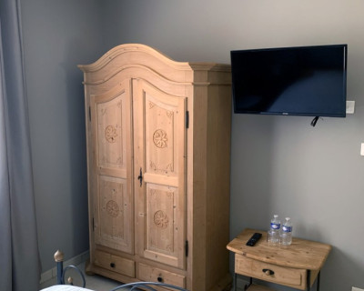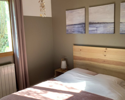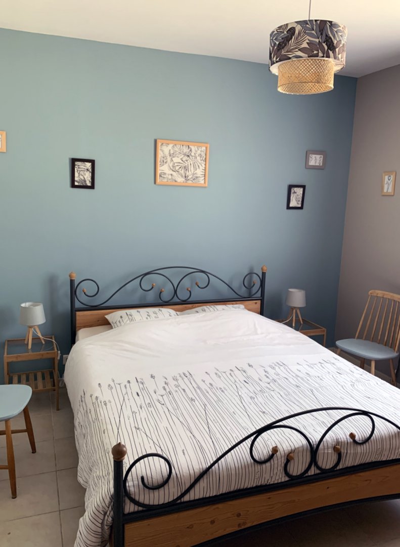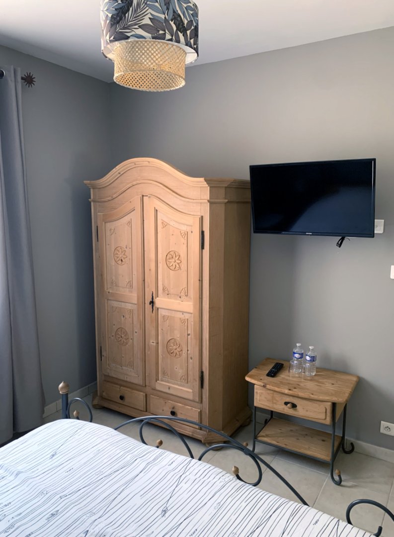 1) la chambre "Feuillage" - belle chambre de 12 m² au rez-de-chaussée, est suffisamment fraîche l'été (orientée soleil couchant) - sans climatisation - TV - vue côté colline, forêt, cour arrière - Lit de 160x200 - Armoire penderie.