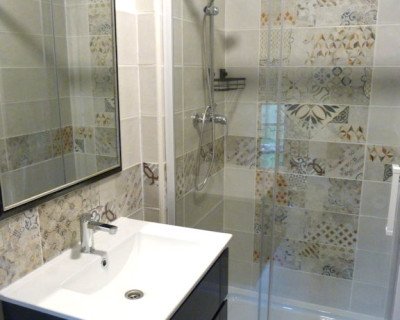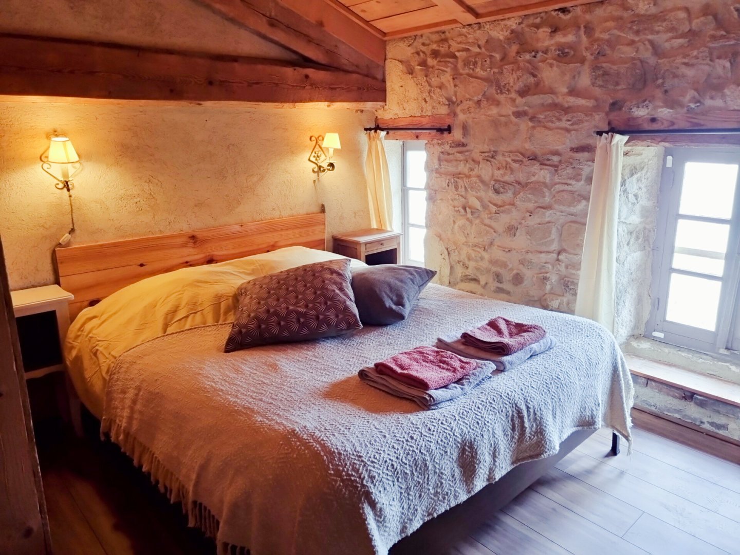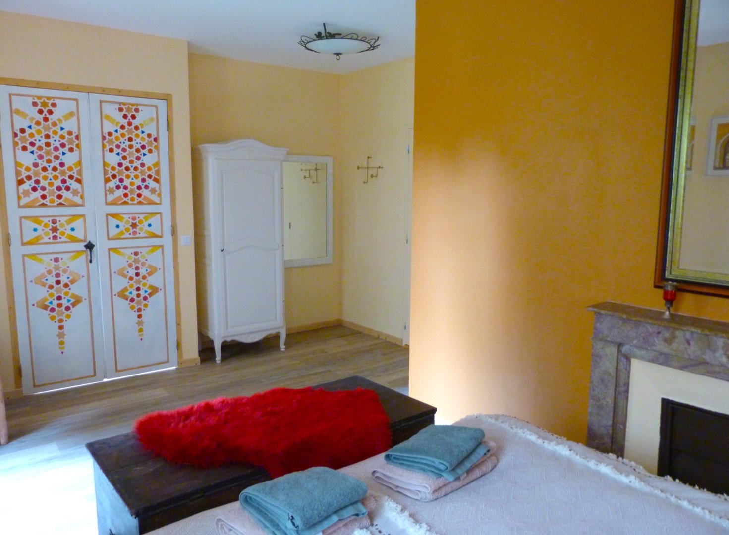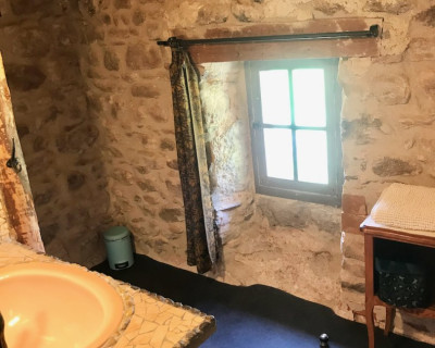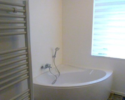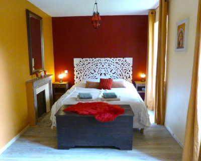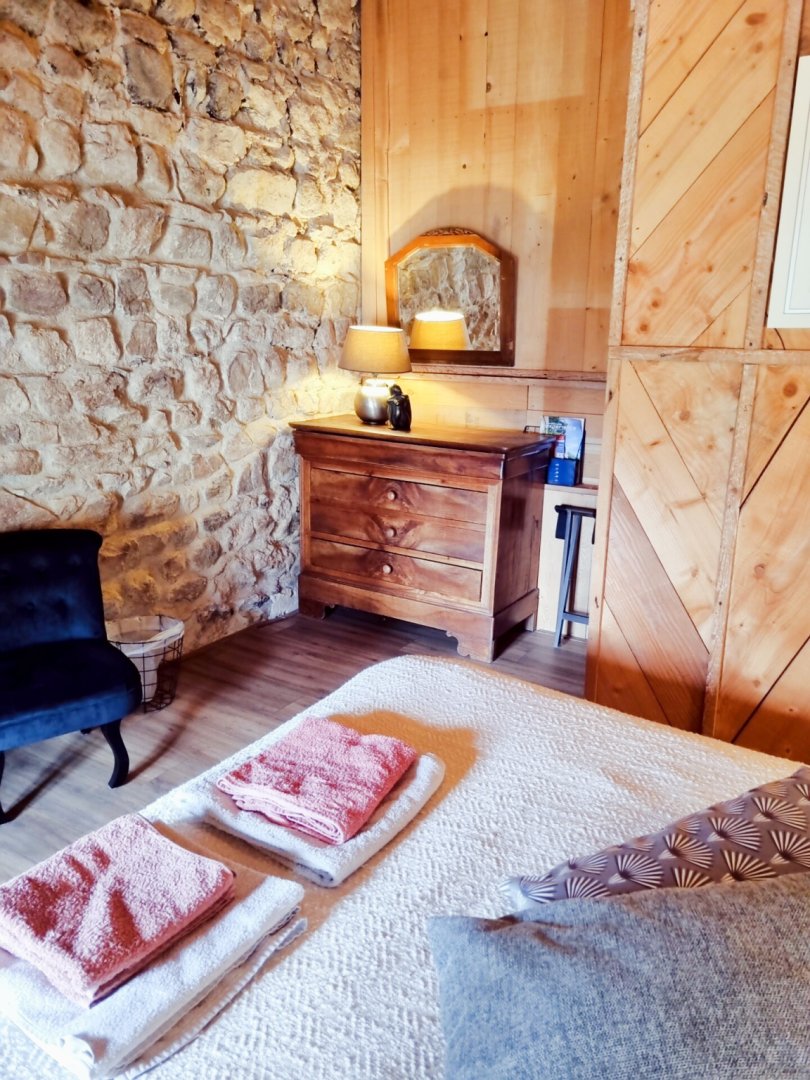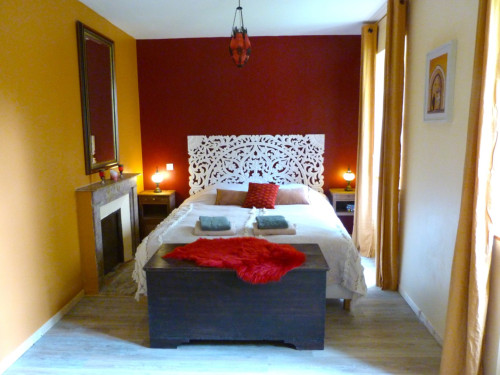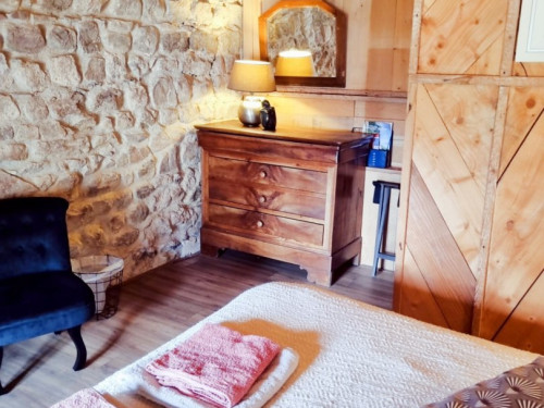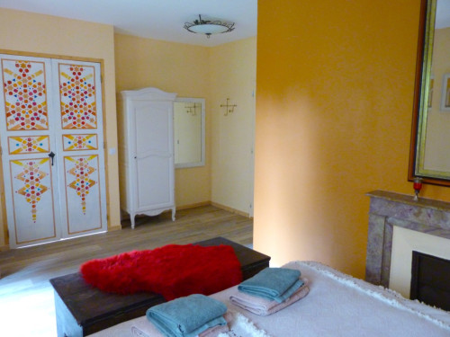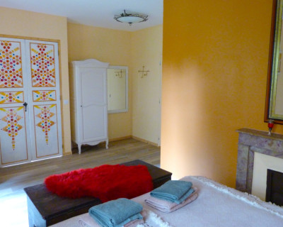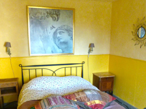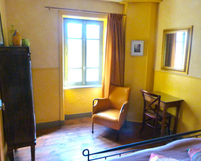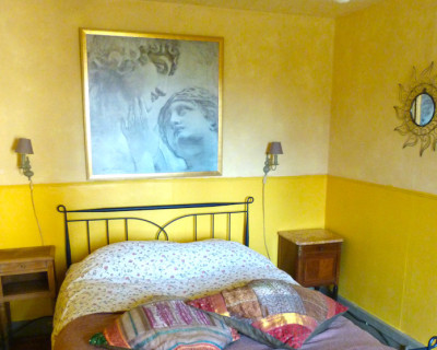 Lit double 1,40 x 2,00 m. Salle de bain privée avec douche et lavabo en face de la chambre, toilettes privées séparées.