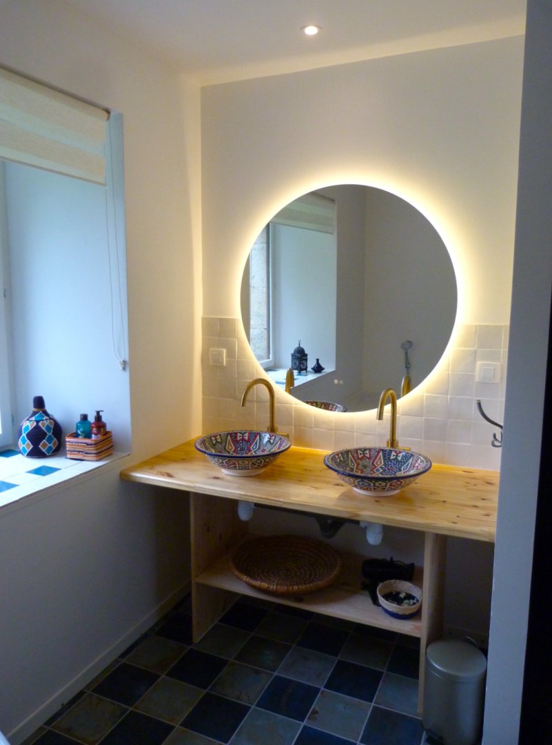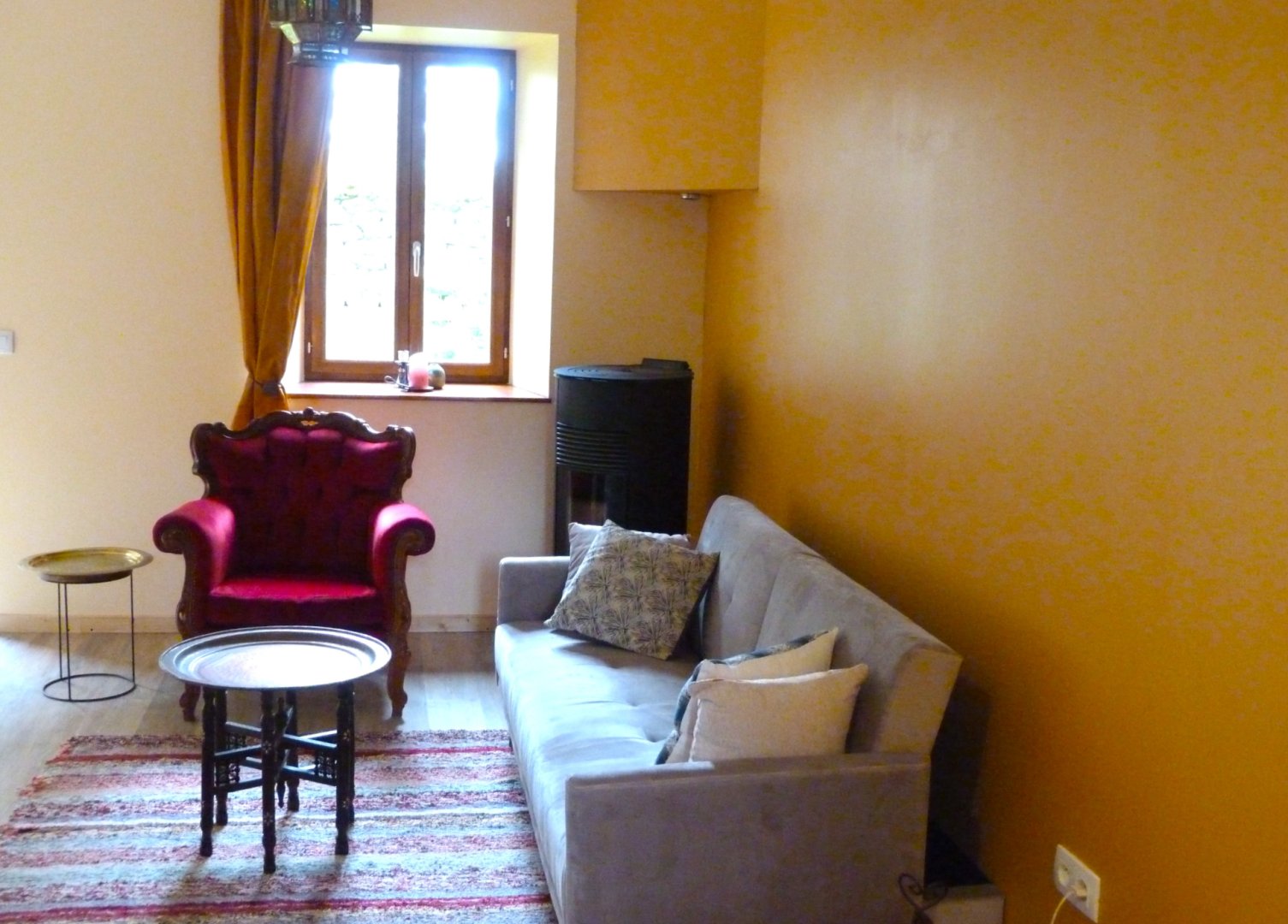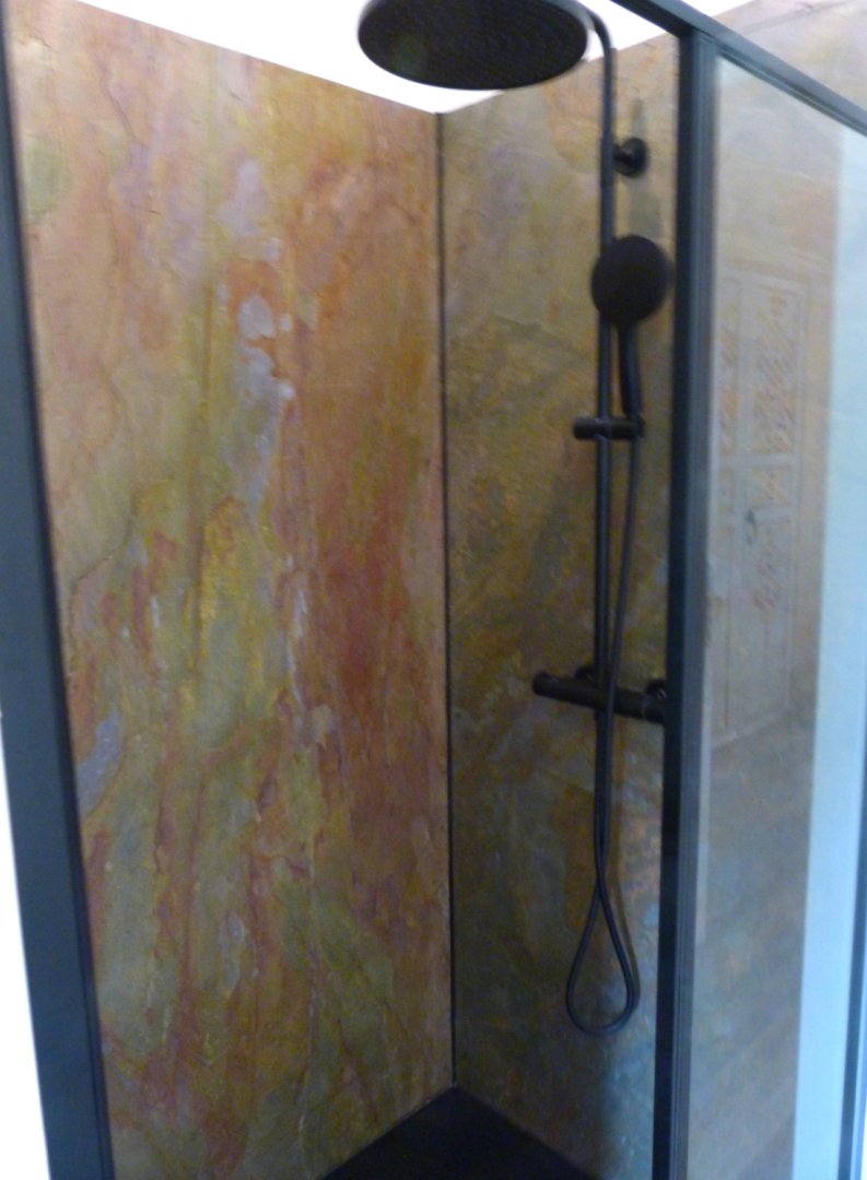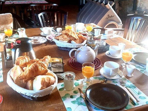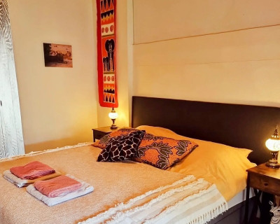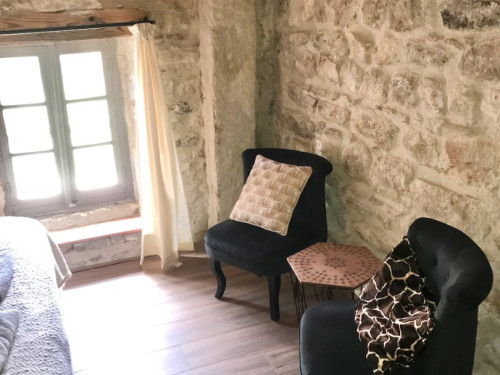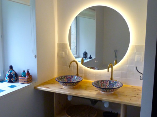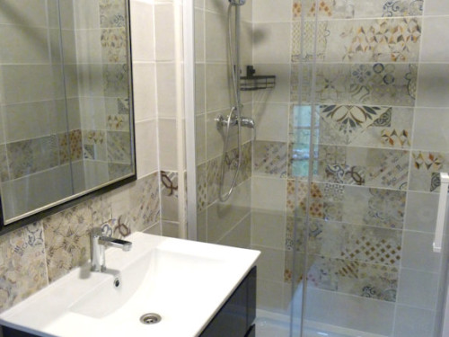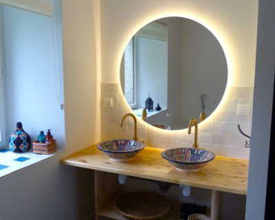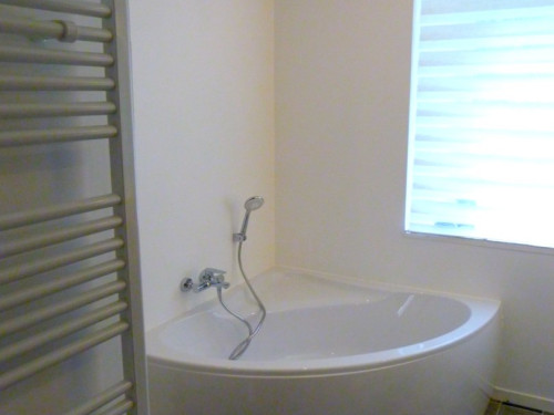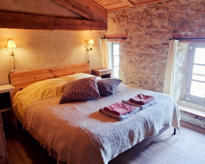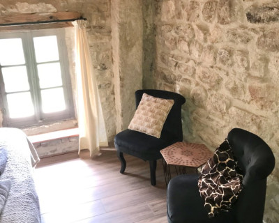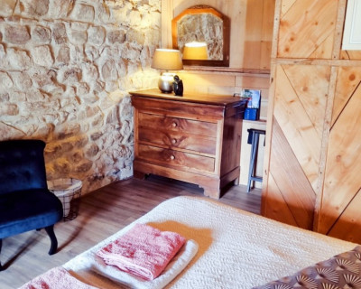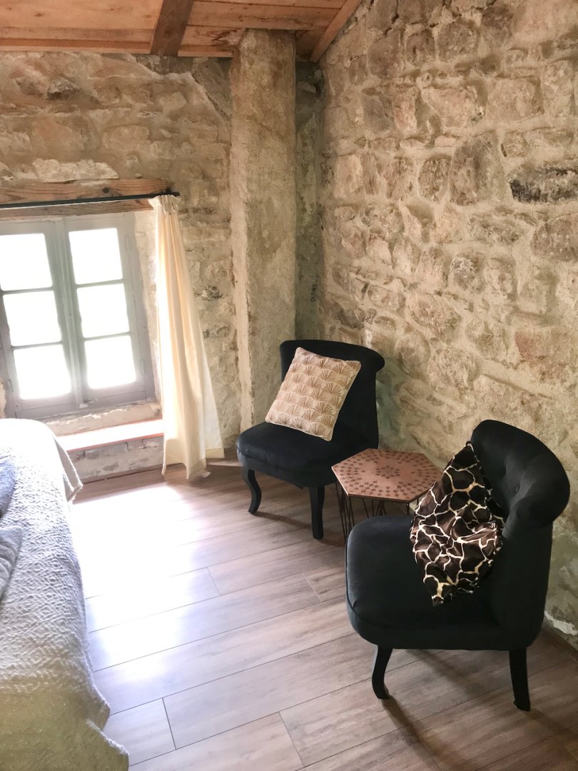 Lit double 1,40 x 2,00 m. Salle de bain privée avec douche et lavabo en face de la chambre, toilettes privées séparées.
