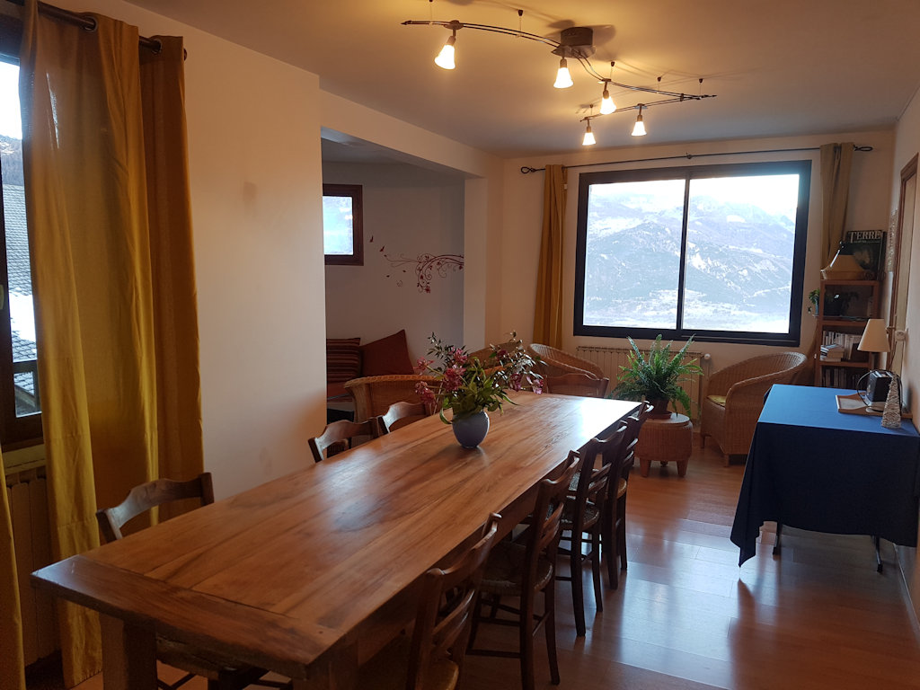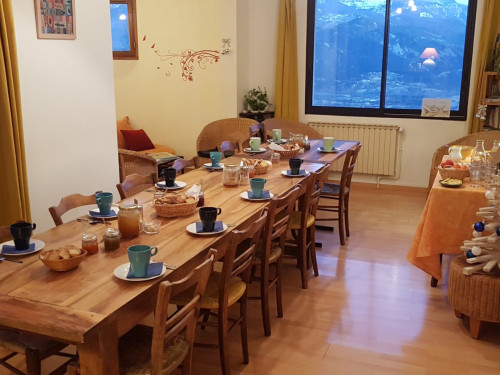 Possibilité de tables d’hôtes sur réservation avec une cuisine généreuse, composée de produits de saison bio et/ou locaux, aux recettes d’ici et d’ailleurs, partagée avec les autres convives sur la terrasse ou dans un salon avec une vue imprenable sur la vallée et ses montagnes.