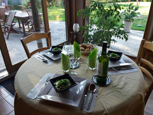 Valérie nous a accueilli très gentiment avec un verre de cidre. Avec d'autres invités, nous avons dégusté un dîner préparé par elle et son mari Pascale, très savoureux et avec vue sur le grand jardin.