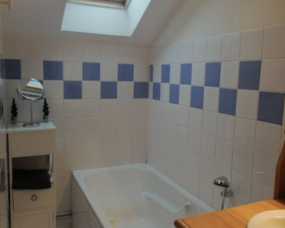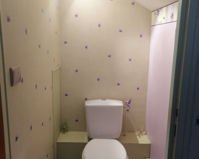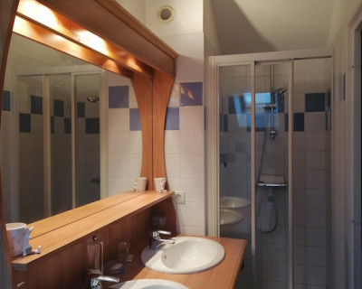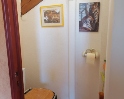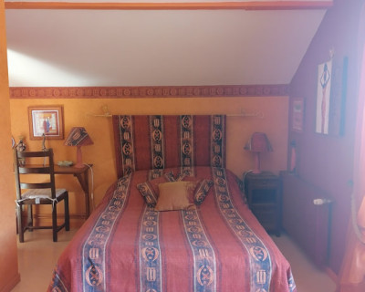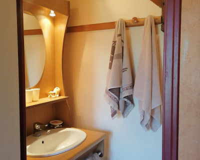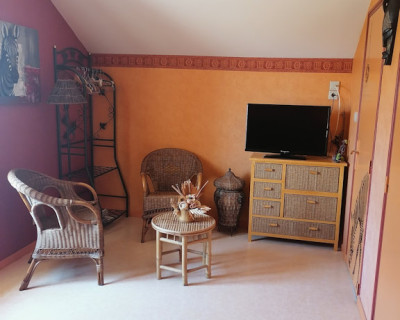 Petit coin salon en rotin avec deux fauteuils et une petite table ronde, un coin bureau avec chaise, un porte vêtements, salle d'eau et WC. Une grande TV avec WiFi et climatisation.