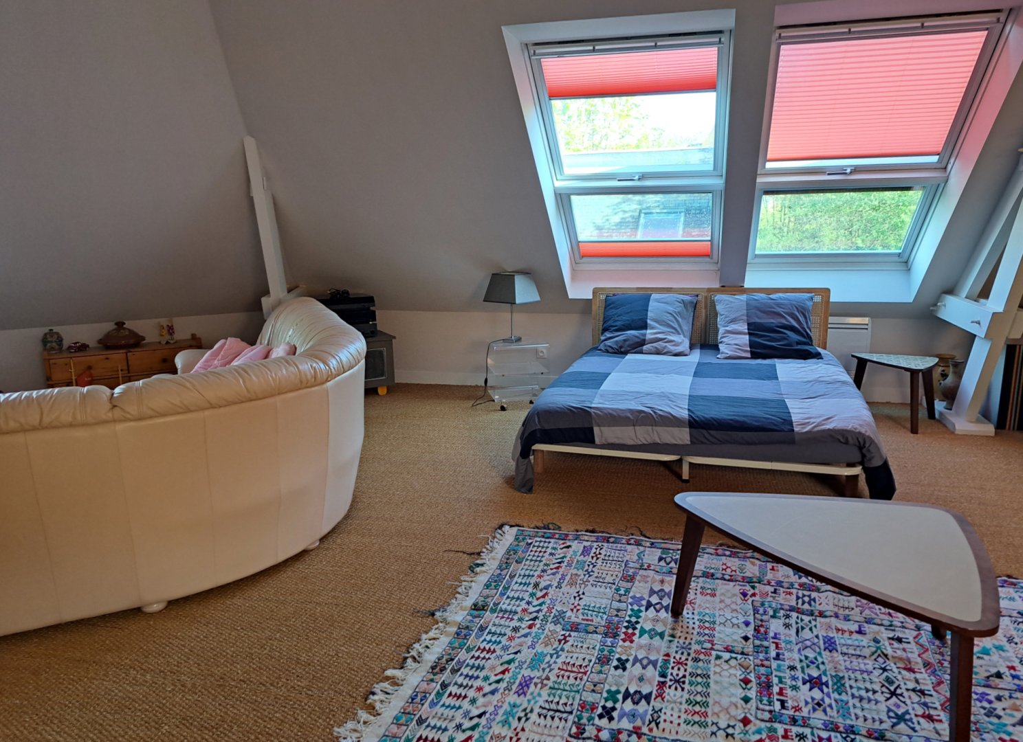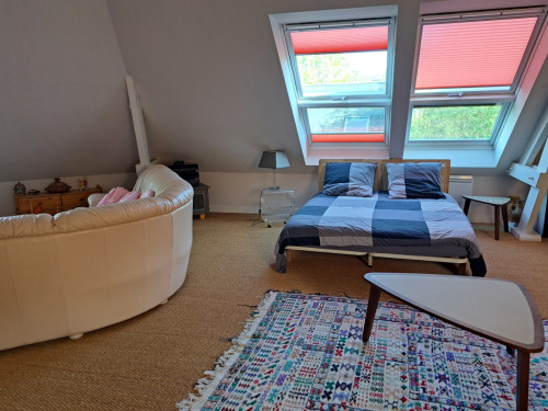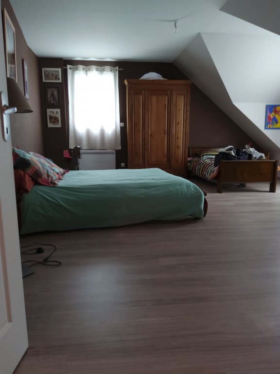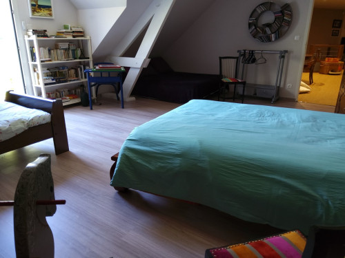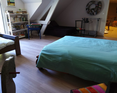 À l'étage : une grande chambre pour 5 personnes 2 lits de 140 et 1 de 90. Sur le grand espace 1 lit de 160 et un canapé pour 2 personnes.