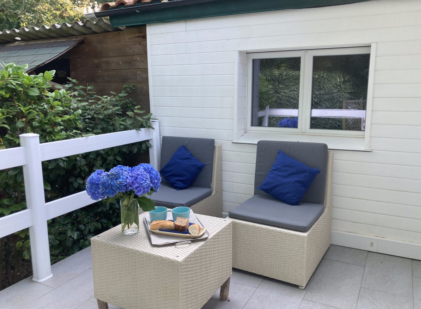 La chambre (Écume pour nous) est agréable, il y a du rangements, une belle salle de bain et une terrasse agréable pour prendre le petit déjeuner, même quand la météo n’est pas de la partie, avec la véranda. Nous avons apprécié aussi la cuisine extérieure, le calme et les conseils.