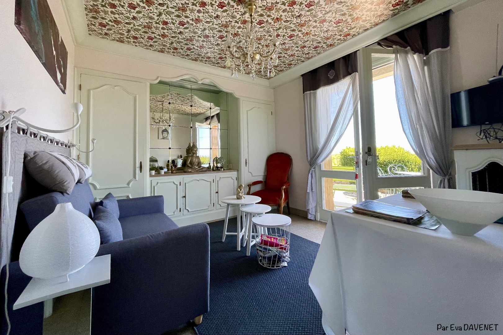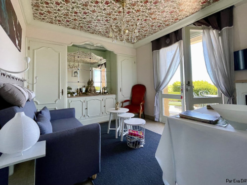 un salon donnant sur la terrasse avec canapé lit 140 pour deux enfants ou un adulte.