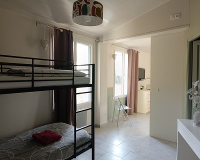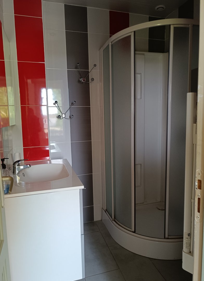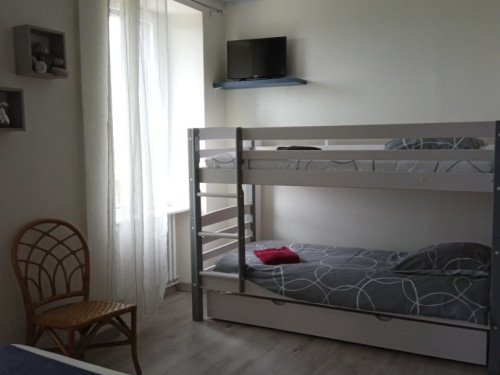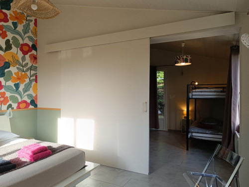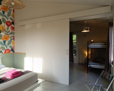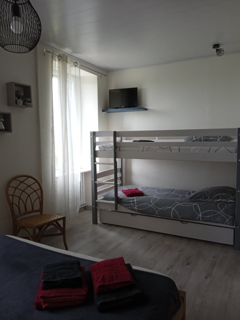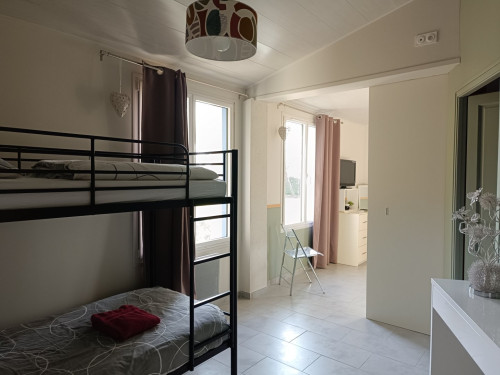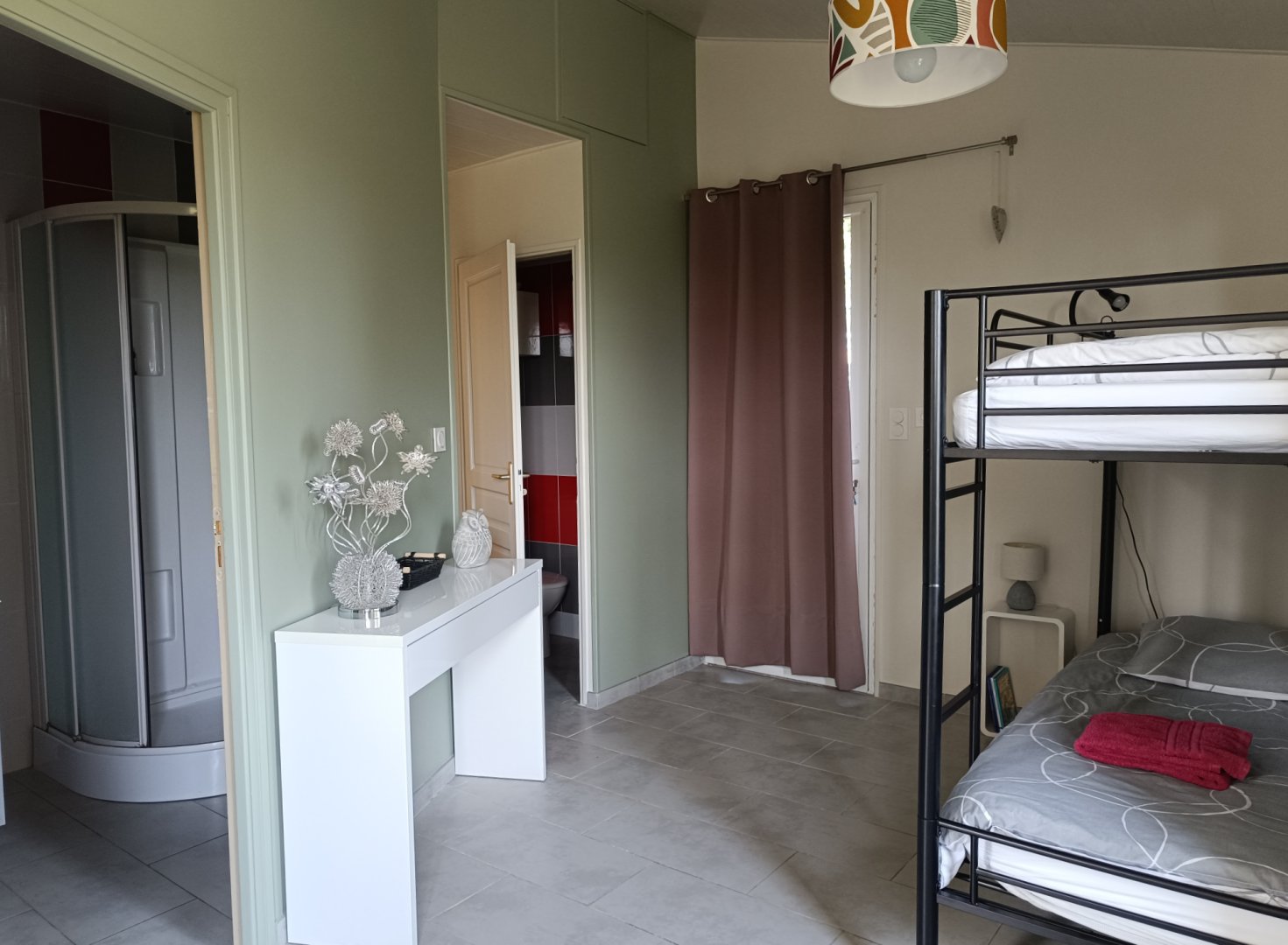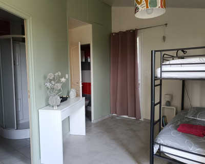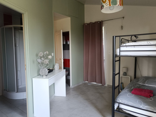 Partie chambre avec lits superposés, salle de bain et wc séparés