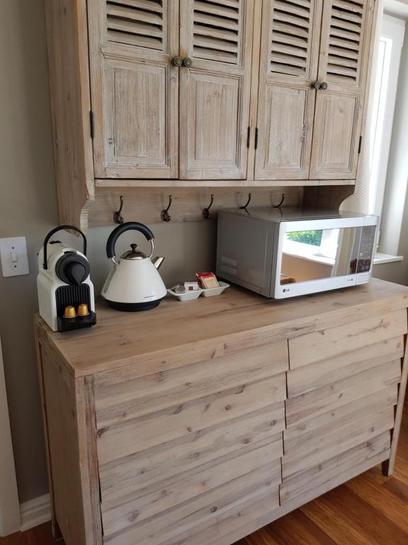 The kitchenette is fitted with a microwave, a fridge and kitchenware, as well as coffee machine and kettle. The property has an outdoor dining area.