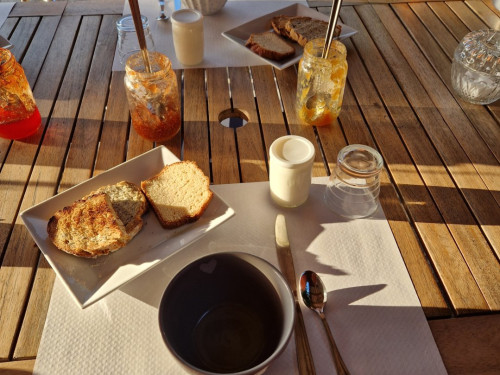 Nous n'avons passé qu'une nuit chez Jacqueline et Gérard qui nous ont chaleureusement accueillis. Tout était parfait : une chambre très propre avec une décoration originale, un bon petit déjeuner copieux, des confitures fait maison, et animé de discussions diverses avec nos hôtes. Un moment bien sympathique.